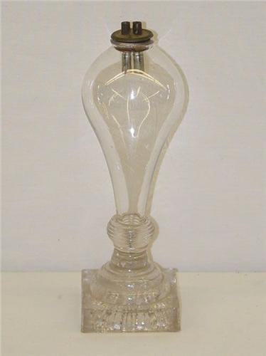 9 1/2" CLEAR SANDWICH FLUID LAMP W/ LIGHT BULB FONT ON STEPPED BASE W/ DOUBLE BURNER - CHIP TO BASE