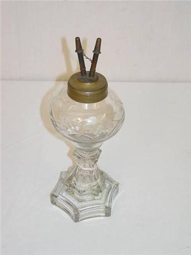 9 1/2" CLEAR SANDWICH OIL LAMP W/ CUT DECORATION ON FONT W/ DOUBLE WHALE BURNER - DAMAGE TO BURNER, MINOR RIM ROUGHNESS;