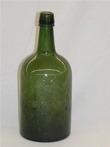 9 1/2" GUILFORD MINERAL SPRING WATER BOTTLE, GUILFORD VT - QUART LIGHT EMERALD GREEN, CONTENT STAINS;