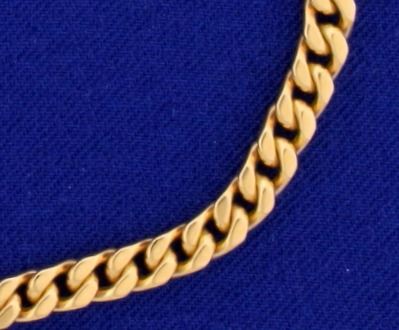 In 14k rose gold. Unique circle clasp is large 19mm in diameter. Curb Chain is 4mm wide. 18.3g.