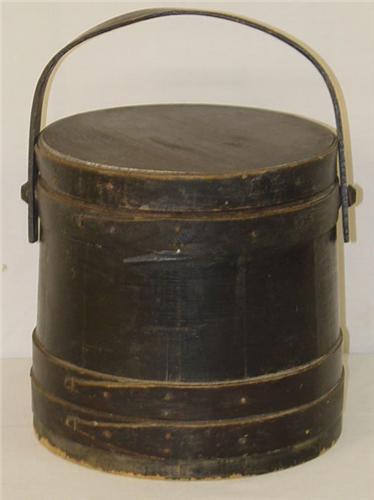 9 1/2" PAINTED WOODEN BANDED FIRKIN W/ LID & SWING HANDLE IN BLACK PAINT - WEAR & IMPERFECTIONS