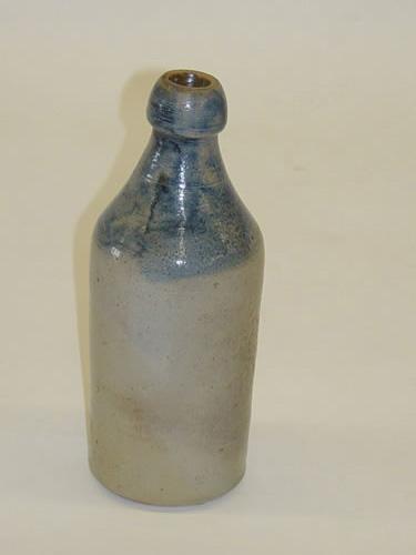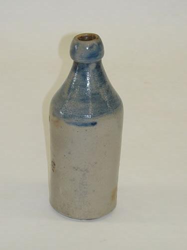 9 1/2" STONEWARE BOTTLE W/ COBALT DECORATION FROM SHOULDER UP, UNMARKED - POTSTONE & CHIP ON BASE RIM;