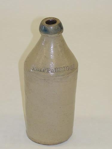 9 1/2" STONEWARE BOTTLE W/ COBALT RING TOP SIGNED TRIPP & BRIGGS - WEAR;