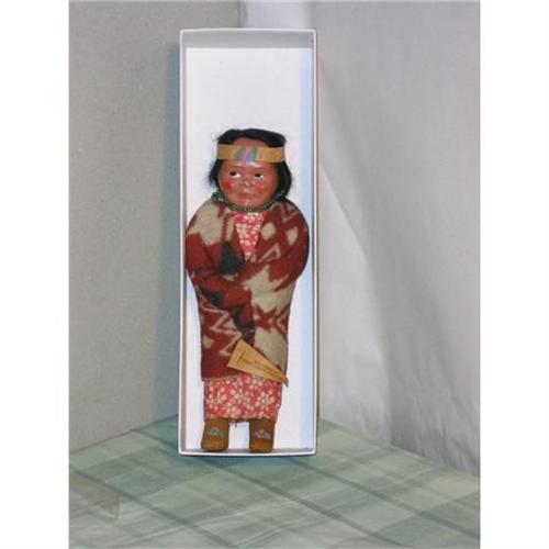 9 ½? tall Right Glancing Skookum doll, female in suede shoes, blanket of red, black & white wool, leather pendant stapled to blanket front states: Souvenir of Great Lakes Centennial. Beads are present. All in good shape.