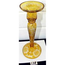 9 1/4" tall by 3 1/2" diameter etched amber candlestick hollow stem with tree and reserve in pattern. Small black mark on base, needs removal. No chips or cracks.