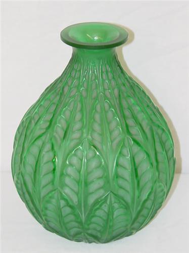 9 1/4" LALIQUE EMERALD GREEN "MALESHERBES" VASE-MARKED R. LALIQUE FRANCE #1014 - GOOD CONDITION