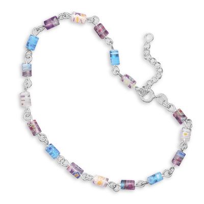 9" + 1" extension sterling silver glass millefiori bead anklet. Beads are approximately 5mm x 4.5mm. Anklet has a spring ring closure.