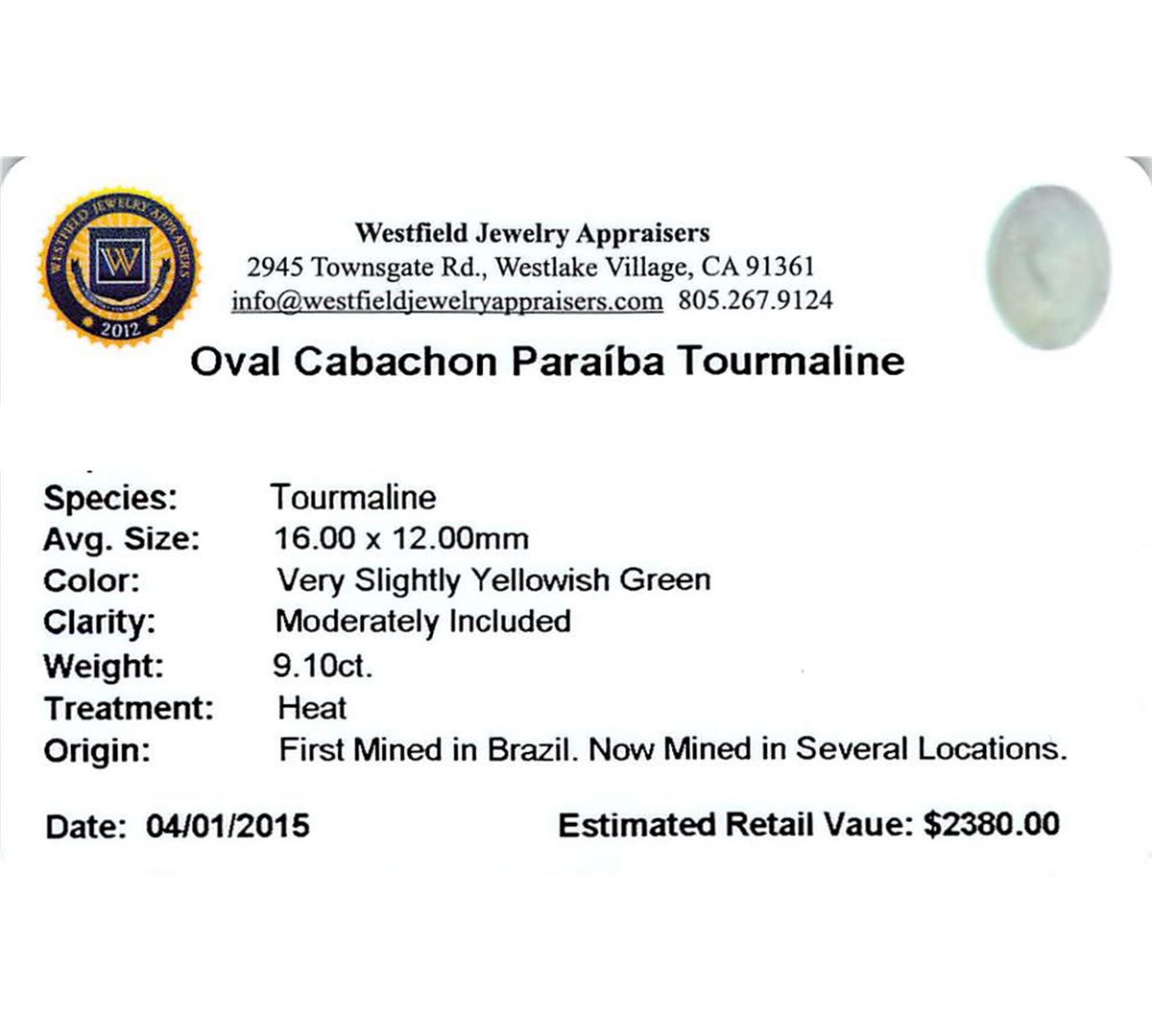 One oval cabochon cut natural Paraiba tourmaline exact weight 9.10ct., clarity is moderately included, cut is good. Westfield Appraised at $2,380.00.