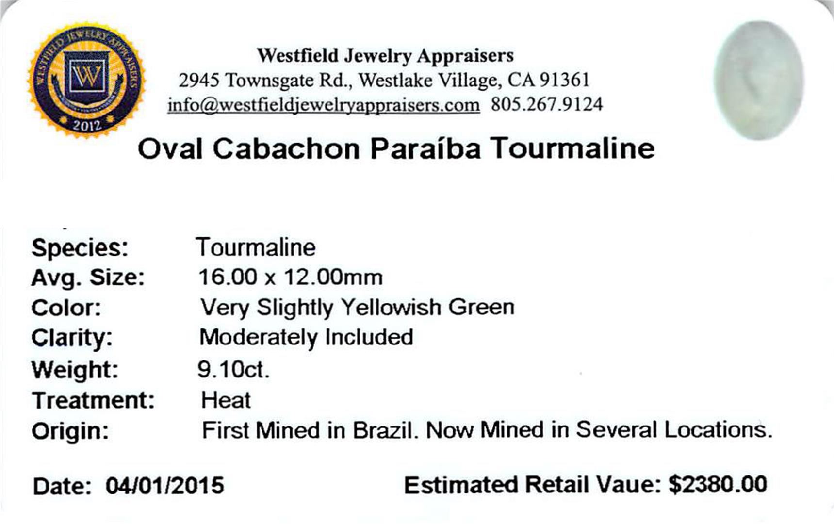 One oval cabochon cut natural Paraiba tourmaline exact weight 9.10ct., clarity is moderately included, cut is good. Westfield Appraised at $2,380.00.