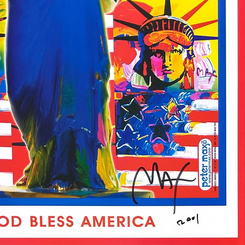 "9-11 God Bless America I" is an offset lithograph on paper by Peter Max, hand signed by the artist. This piece comes custom framed. Includes Letter of Authenticity. Measures approx. 28" x 22" (frame), 24" x 18" (image). This item requires special handling and may have a longer than usual turnaround.