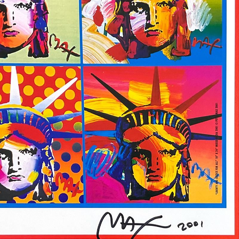 "9-11 Liberty & Justice for All" is an offset lithograph on paper by Peter Max, hand signed by the artist. This piece comes custom framed. Includes Letter of Authenticity. Measures approx. 28" x 22" (frame), 24" x 18" (image). This item requires special handling and may have a longer than usual turnaround.