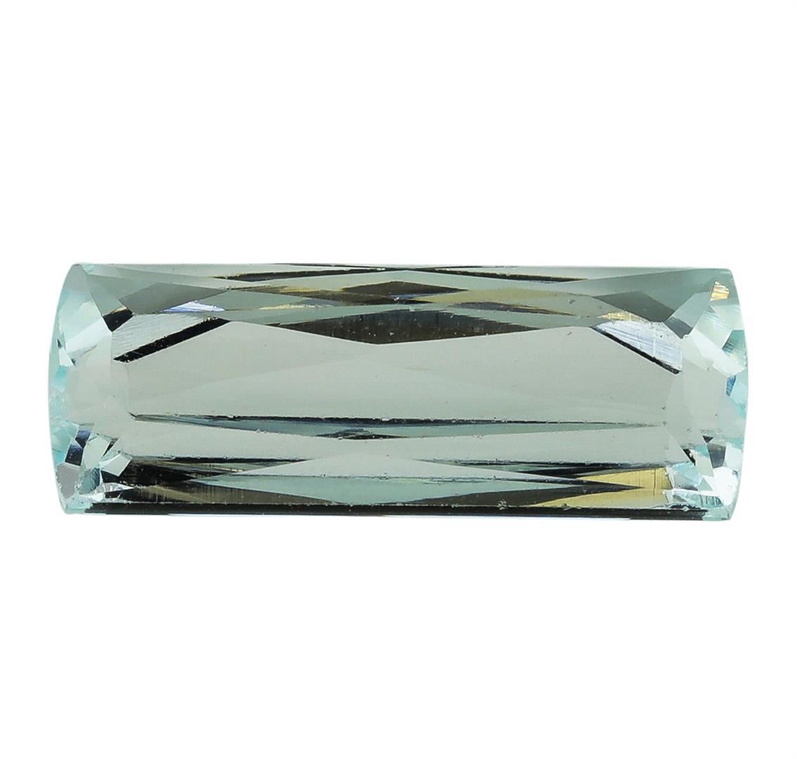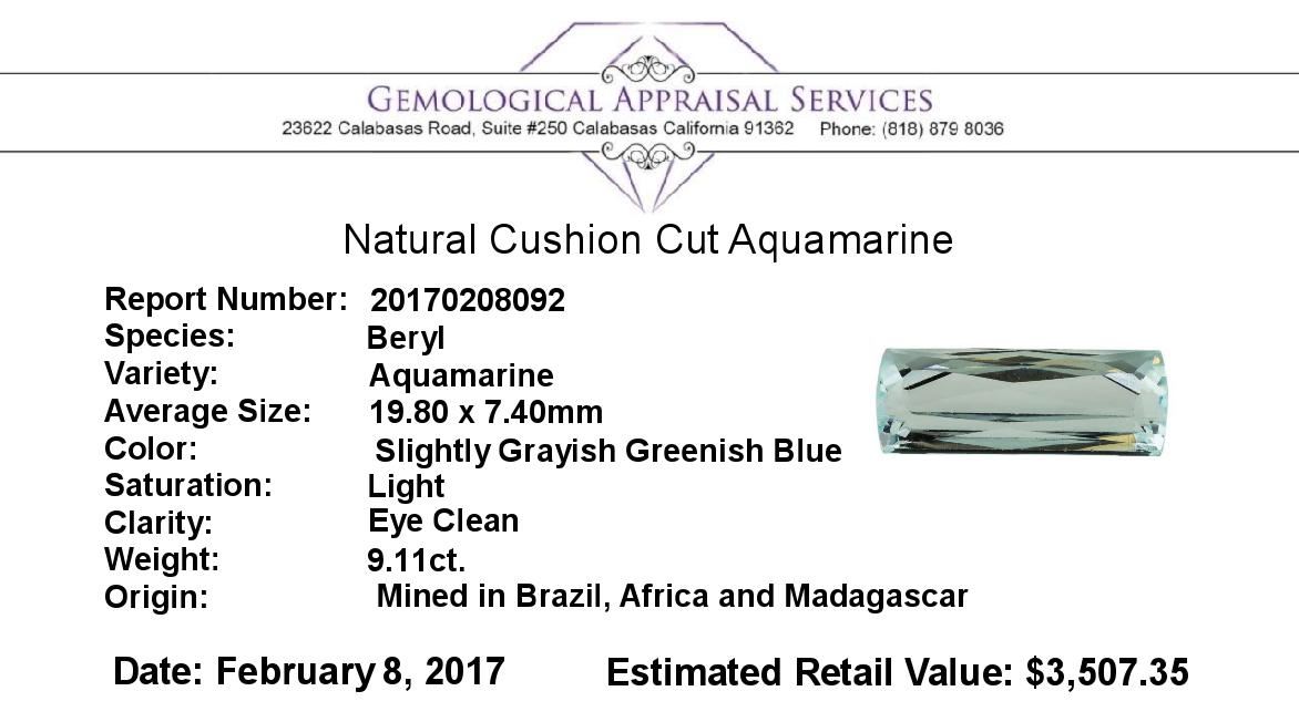 One natural cushion cut aquamarine with an exact weight of 9.11ct., clarity is eye clean, slightly grayish greenish blue, light. Gemological Appraisals Services estimates the retail value at $3507.35 GAS Appraised.