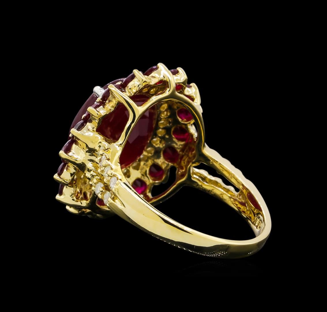 14K Gold Ruby & Diamond Ring. One polished, stamped, and tested 14K yellow gold ring mounted with: 19 faceted rubies weighing approximately 9.11 carats, and 46 faceted diamonds weighing approximately 0.43 carats. This item weighs 6.1 grams, condition is new, very good workmanship. Main gemstones: Species: Natural Corundum. Variety: Ruby. Shape: Oval/Round. Quantity: 19 rubies. Measurements: 11.0 x 9.8 x 7.3 mm (1 Oval). 2.7 mm (18 round). Total Weight: 9.11 carats. Color: Red. Cut grade: Very good. Treatment: Fracture filled. Refractive index: 1.762-1.770 DR. Birefringence: 0.008-0.010. Hardness: 9. Adjacent Gemstones on Ring: Identity: Natural Diamond. Shape: Round. Cutting Style: Brilliant Cut. Quantity: 46 Diamonds. Measurements: 1.0 mm. Total weight: 0.43 carats. Clarity grade: I1-I2. Color grade: J-K. Refractive index: 2.418. Hardness: 10. Gold content: 14K Yellow gold. AIGL Appraised at $4,123.00.