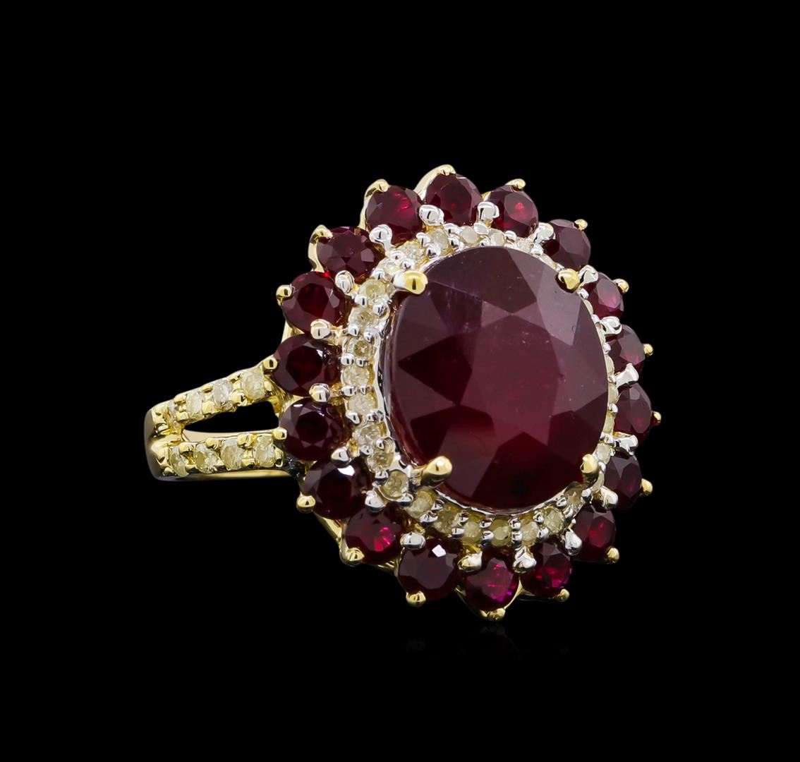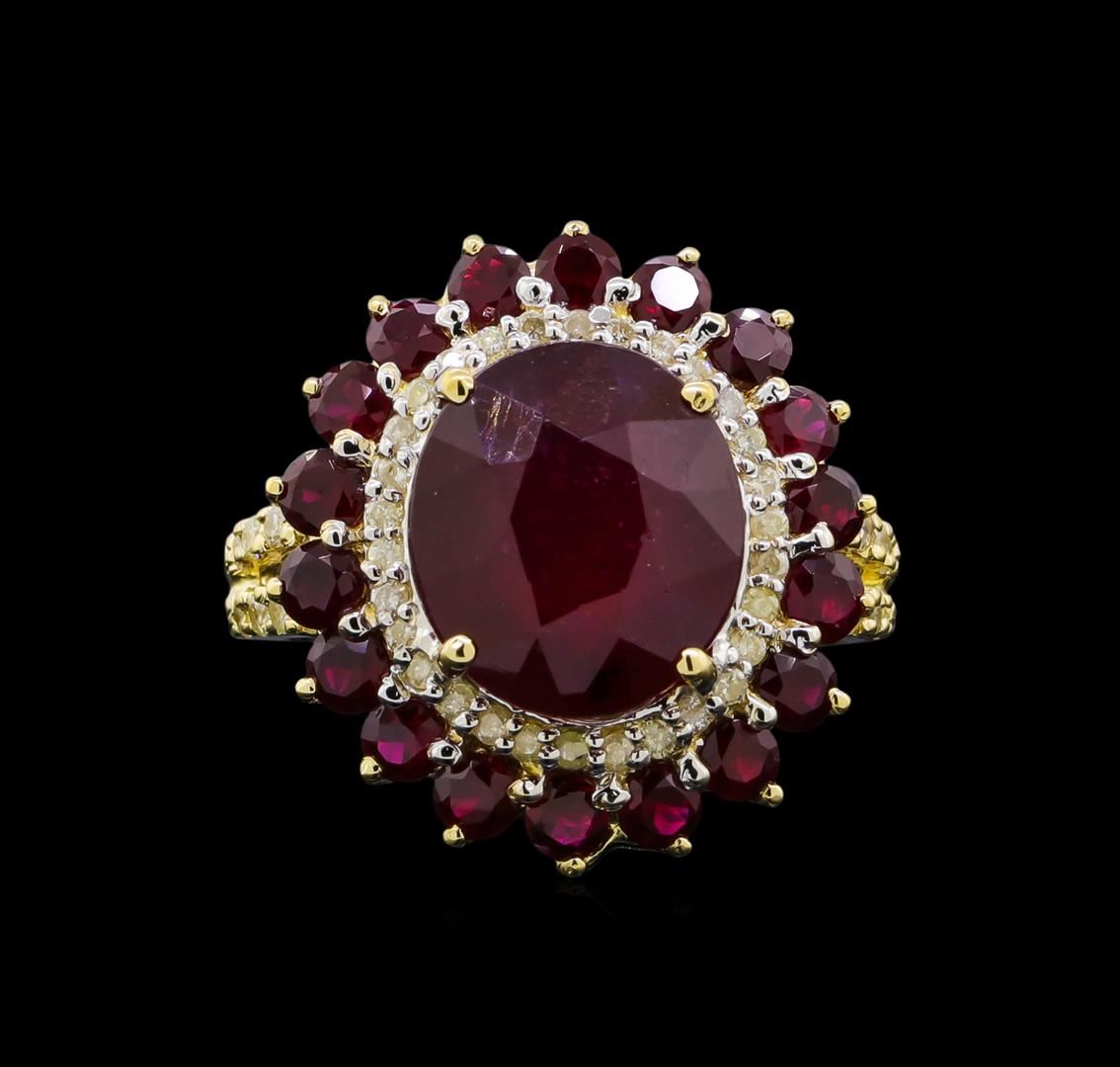 14K Gold Ruby & Diamond Ring. One polished, stamped, and tested 14K yellow gold ring mounted with: 19 faceted rubies weighing approximately 9.11 carats, and 46 faceted diamonds weighing approximately 0.43 carats. This item weighs 6.1 grams, condition is new, very good workmanship. Main gemstones: Species: Natural Corundum. Variety: Ruby. Shape: Oval/Round. Quantity: 19 rubies. Measurements: 11.0 x 9.8 x 7.3 mm (1 Oval). 2.7 mm (18 round). Total Weight: 9.11 carats. Color: Red. Cut grade: Very good. Treatment: Fracture filled. Refractive index: 1.762-1.770 DR. Birefringence: 0.008-0.010. Hardness: 9. Adjacent Gemstones on Ring: Identity: Natural Diamond. Shape: Round. Cutting Style: Brilliant Cut. Quantity: 46 Diamonds. Measurements: 1.0 mm. Total weight: 0.43 carats. Clarity grade: I1-I2. Color grade: J-K. Refractive index: 2.418. Hardness: 10. Gold content: 14K Yellow gold. AIGL Appraised at $4,123.00.