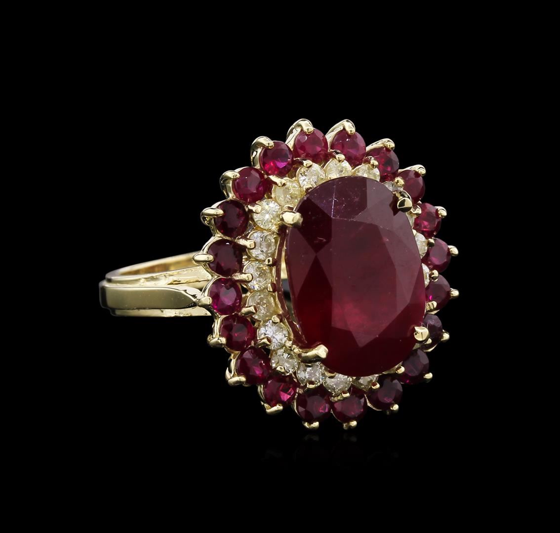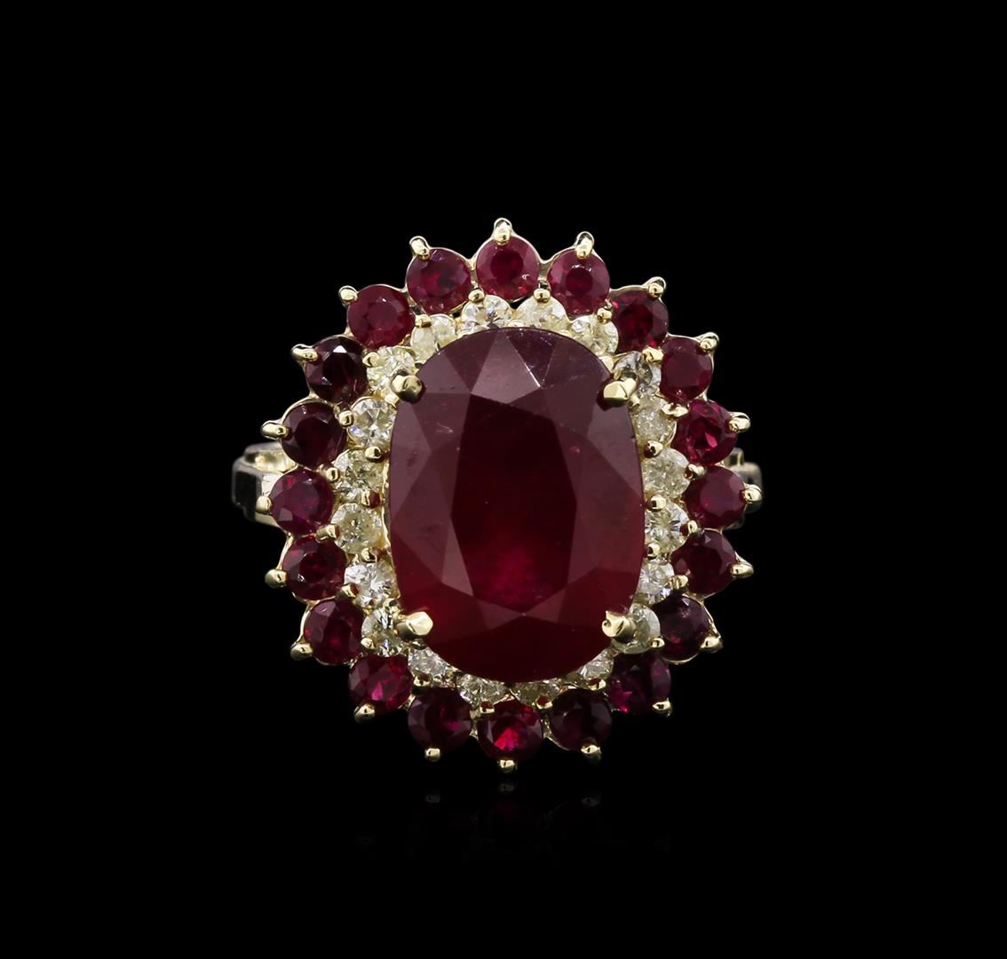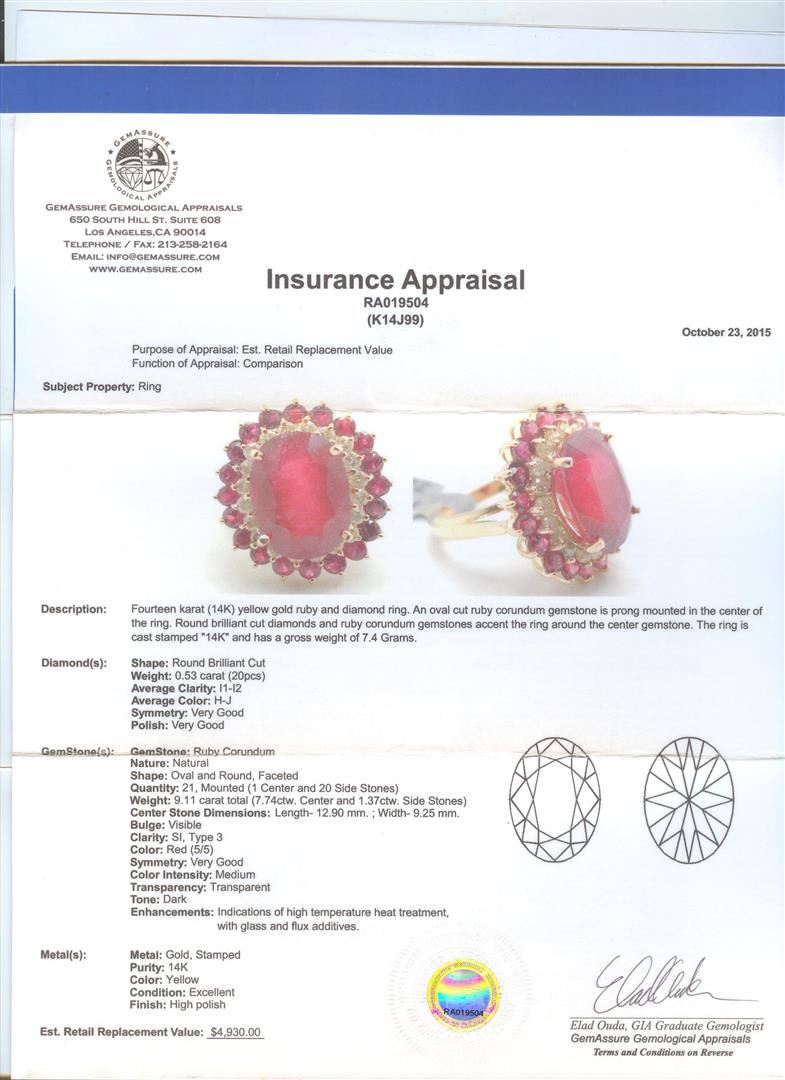 Fourteen karat (14K) yellow gold ruby and diamond ring. An oval cut ruby corundum gemstone is prong mounted in the center of the ring. Round brilliant cut diamonds accent the ring around the center gemstone. The ring is cast stamped "14K" and has a gross weight of 7.4 Grams. Diamond(s): Shape: Round Brilliant Cut. Weight: 0.53 carat (20pcs). Average Clarity: I1-I2. Average Color: H-J. Symmetry: Very Good. Polish: Very Good. GemStone(s): Ruby Corundum. Nature: Natural. Shape: Oval, Faceted. Quantity: 20, Mounted 1 (Center and 20 Side Stones). Weight: 9.11 carat total (7.74ctw. Center and 1.37ctw. Side Stones). Dimensions: Length- 12.90 mm. ; Width 9.25 mm. Bulge: Visible. Clarity: SI, Type 3. Color: Red (5/5). Symmetry: Very Good. Color Intensity: Medium. Transparency: Transparent. Tone: Dark. Enhancements: Indications of high temperature heat treatment, with glass and flux additives. Metal(s): Metal: Gold, Stamped. Purity: 14K. Color: Yellow. Condition: Excellent. Finish: High polish. GGA Appraised at $4,930.00.