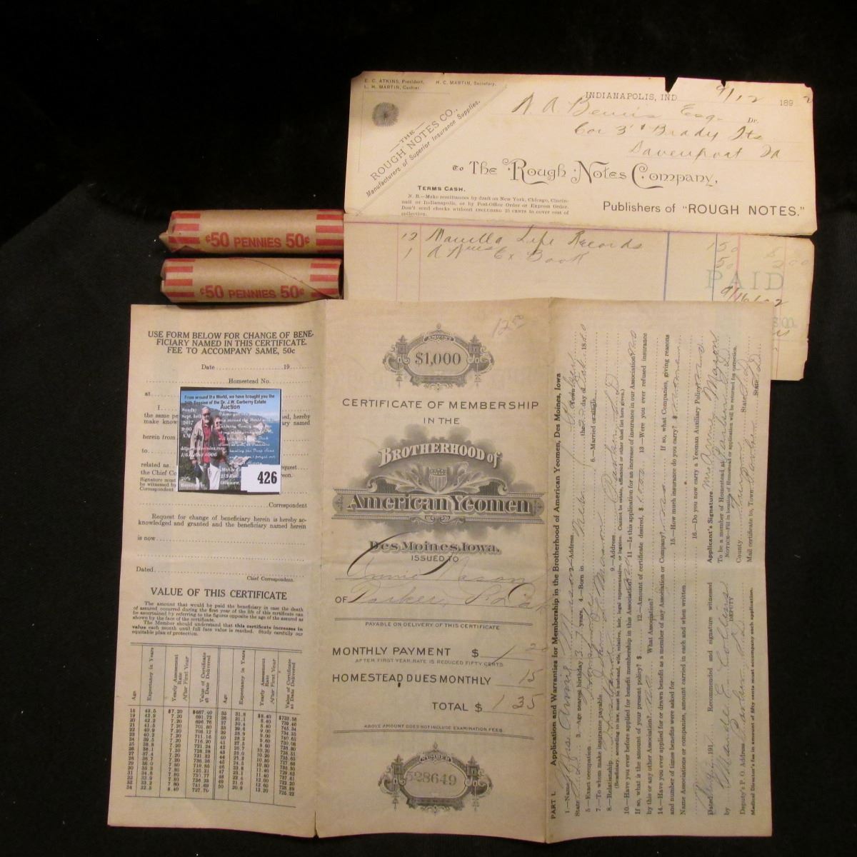 9/12/1892 Paid Invoice "The Rough Notes Company"; $1,000 Certificate "Brotherhood of American Yeoman Des Moines, Iowa" complete with notary seal, ready to be framed; & a pair of unsorted by me rolls of old U.S. Wheat Cents.