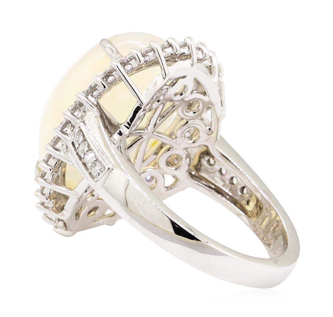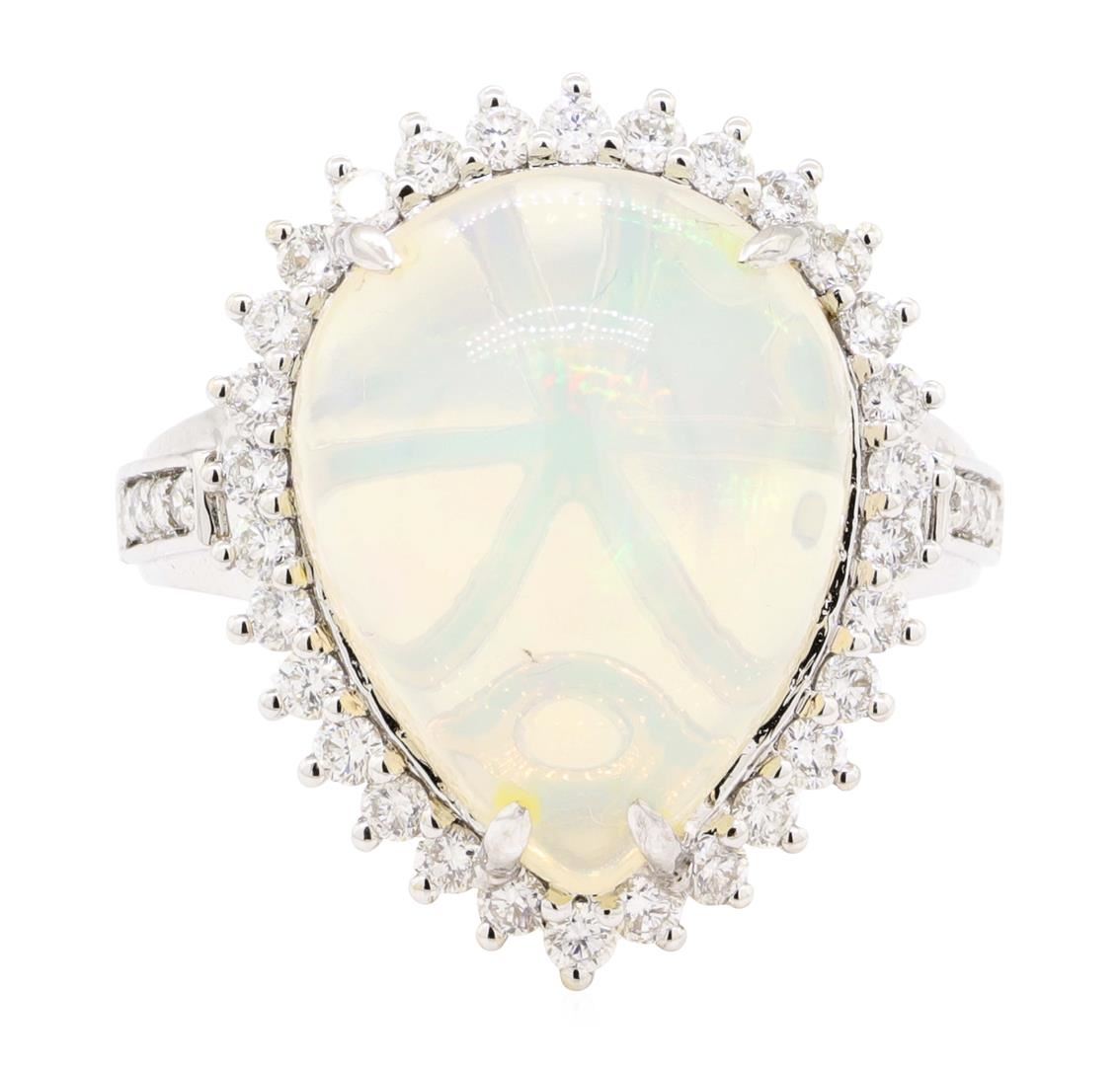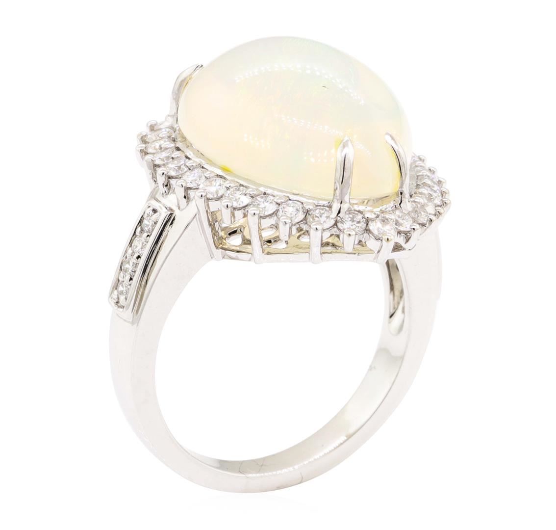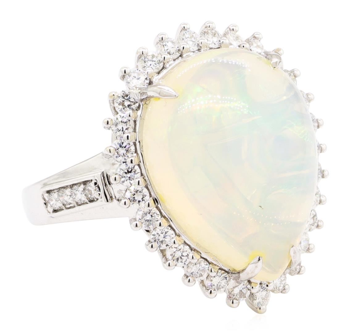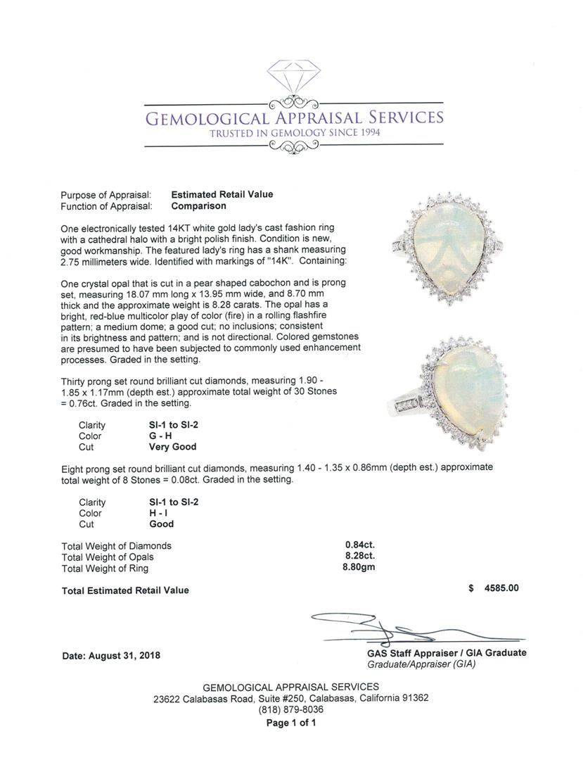 One electronically tested 14KT white gold lady's cast fashion ring with a cathedral halo with a bright polish finish. The featured lady's ring has a shank measuring 2.75 millimeters wide. Identified with markings of '14K'. Condition is new, good workmanship. Containing: One crystal opal that is cut in a pear shaped cabochon and is prong set, measuring 18.07 mm long x 13.95 mm wide, and 8.70 mm thick and the approximate weight is 8.28 carats. The opal has a bright, red-blue multicolor play of color (fire) in a rolling flashfire pattern; a medium dome; a good cut; no inclusions; consistent in its brightness and pattern; and is not directional. Colored gemstones are presumed to have been subjected to commonly used enhancement processes. Graded in the setting. Thirty prong set round brilliant cut diamonds, measuring 1.90 - 1.85 x 1.17mm (depth est.) approximate total weight of 30 Stones = 0.76ct. Graded in the setting. Color G - H Clarity SI-1 to SI-2 Cut Very Good Eight prong set round brilliant cut diamonds, measuring 1.40 - 1.35 x 0.86mm (depth est.) approximate total weight of 8 Stones = 0.08ct. Graded in the setting. Color H - I Clarity SI-1 to SI-2 Cut Good. Total Weight of Diamonds 0.84ct.. Total Weight of Opals 8.28ct.. Total Weight of Ring 8.80gm GAS Appraised at $4585.00. GAS Appraised at $4,585.00.