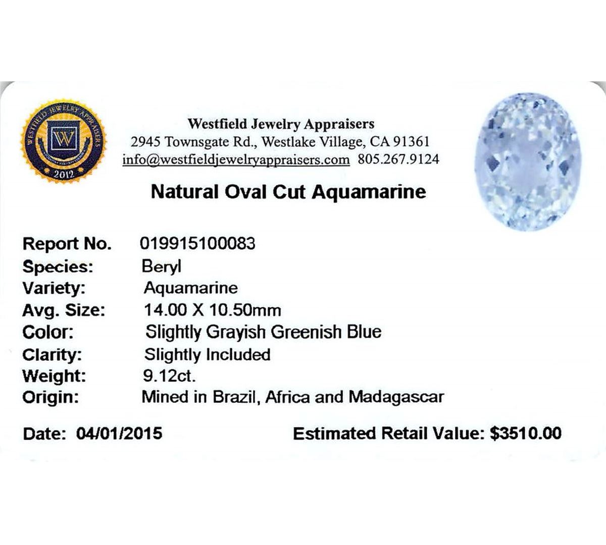 One oval cut natural aquamarine exact weight 9.12ct., clarity is slightly included, type I, medium light, slightly grayish, very slightly greenish blue color, (GIA vslgB 4/2), cut is good. Westfield Appraised at $3,510.00.
