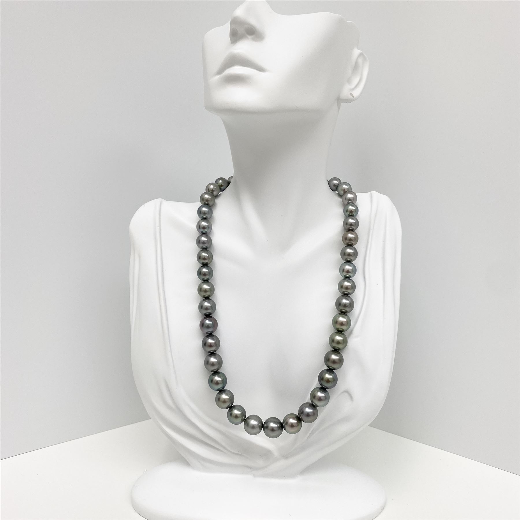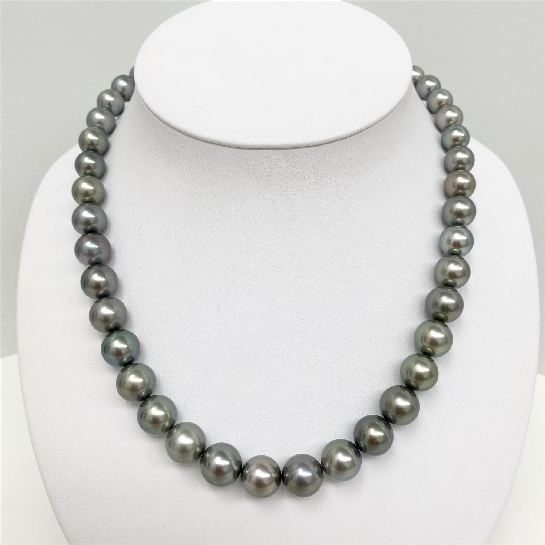 AAAA Quality, Tahitian Silvery Green Round Pearl Necklace, 18 inches hand-knotted with gold fish-hook clasp #CP74