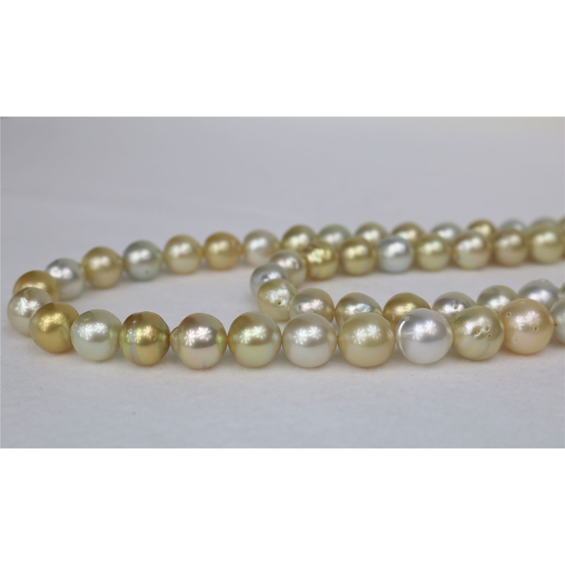 White and Golden South Sea Near Round Multi Color Long Necklace, 33 inches hand knotted with gold fishhook clasp #CP35