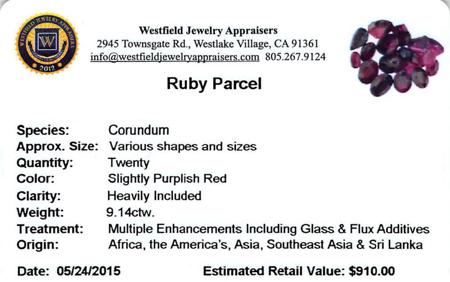 Twenty various shapes & sizes cut natural rubies exact total weight 9.14ct., clarity is heavily included, type II, dark, very slightly brownish, slightly purplish red color, (GIA slpR 7/3), cut is good. Transmitting light somewhat diffusely, transparent to translucent. Naturally occurring internal & external characteristics are present. Indications of laboratory high temperature heat treatment, with glass & flux additives. Ruby has a low tolerance to rhodium plating, repolishing the surface, & ultrasonic cleaning. Westfield Appraised at $910.00.