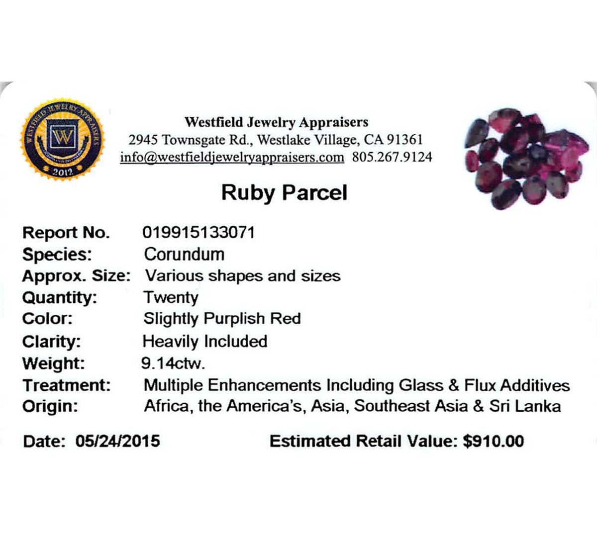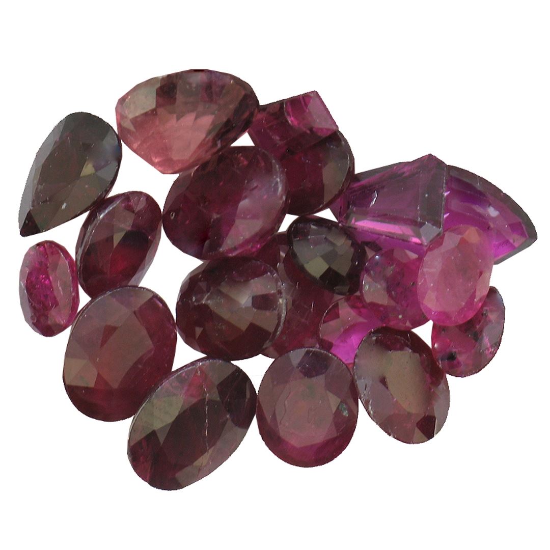 Twenty various shapes & sizes cut natural rubies exact total weight 9.14ct., clarity is heavily included, type II, dark, very slightly brownish, slightly purplish red color, (GIA slpR 7/3), cut is good. Transmitting light somewhat diffusely, transparent to translucent. Naturally occurring internal & external characteristics are present. Indications of laboratory high temperature heat treatment, with glass & flux additives. Ruby has a low tolerance to rhodium plating, repolishing the surface, & ultrasonic cleaning. Westfield Appraised at $910.00.