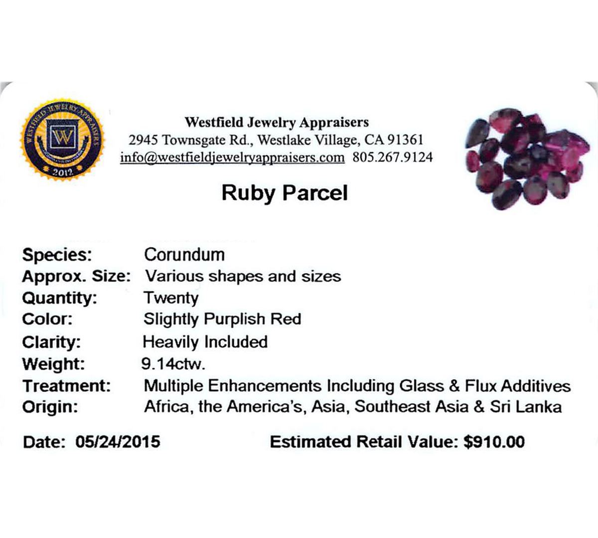 Twenty various shapes & sizes cut natural rubies exact total weight 9.14ct., clarity is heavily included, type II, dark, very slightly brownish, slightly purplish red color, (GIA slpR 7/3), cut is good. Transmitting light somewhat diffusely, transparent to translucent. Naturally occurring internal & external characteristics are present. Indications of laboratory high temperature heat treatment, with glass & flux additives. Ruby has a low tolerance to rhodium plating, repolishing the surface, & ultrasonic cleaning. Westfield Appraised at $910.00.