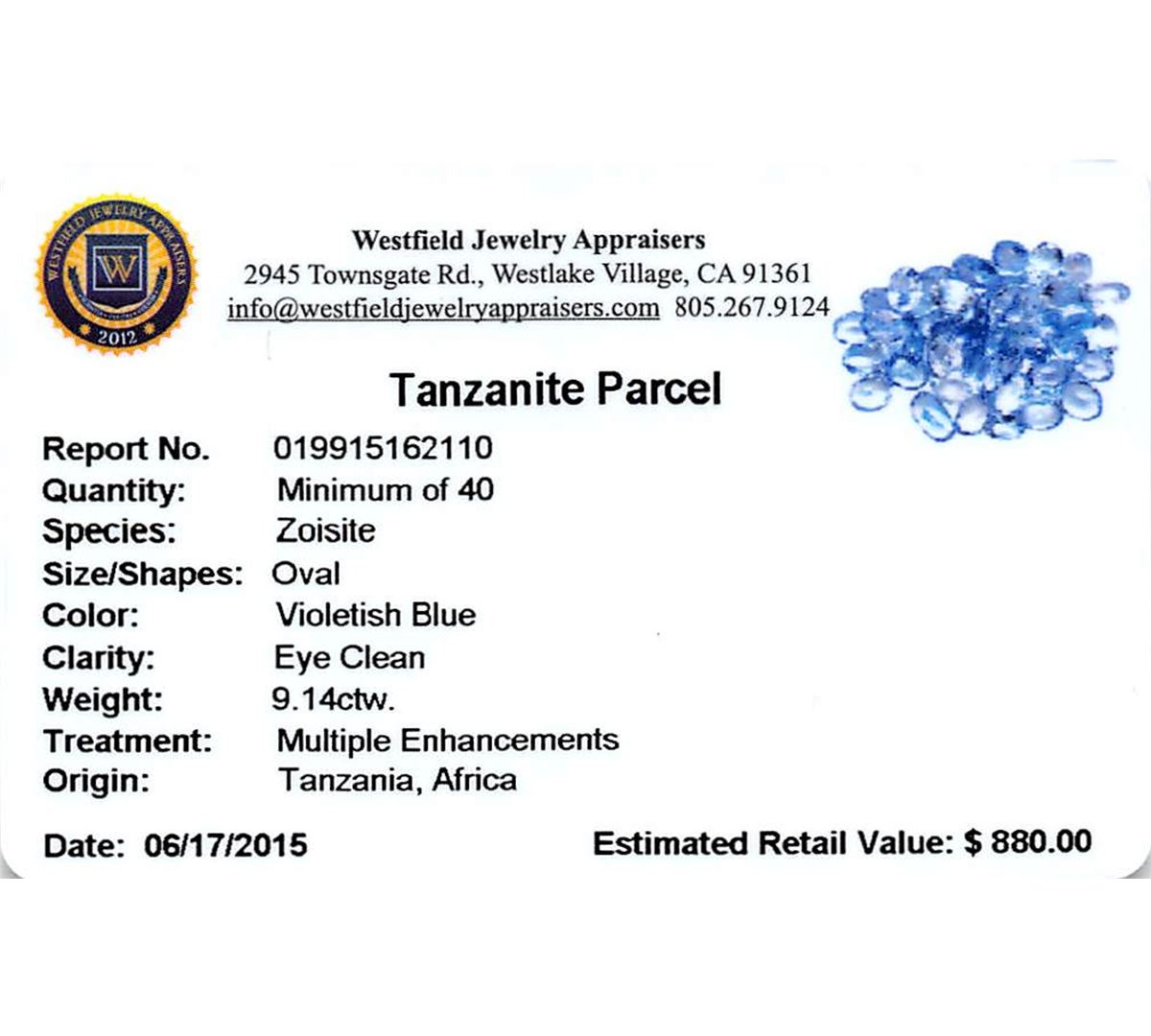 Forty oval mixed cut natural tanzanites exact total weight 9.14ct., clarity is slightly included, type I, medium dark, very slightly grayish, violetish blue color, (GIA vB 6/3), cut is good. Transmitting light with a minimum of distortion, transparent. Naturally occurring internal & external characteristics are present. Color grade is an average for the group. Tanzanite is a very rare gemstone that is only found in the country of Tanzania. Originally discovered in 1967. Tiffany & Company, named the stone Tanzanite. It is found in the Usumburu Mountains that border the Umba Valley of northern Tanzania. Tanzanite occurs in gray, brown, violet, blue, reddish-purple, & green. The gem is interesting because of its exceptional pleochroism. Rotated in different directions a tanzanite will exhibit multiple changes of color. Tanzanite has a low tolerance to ultrasonic cleaning, and should not be cleaned using this method. Westfield Appraised at $880.00.