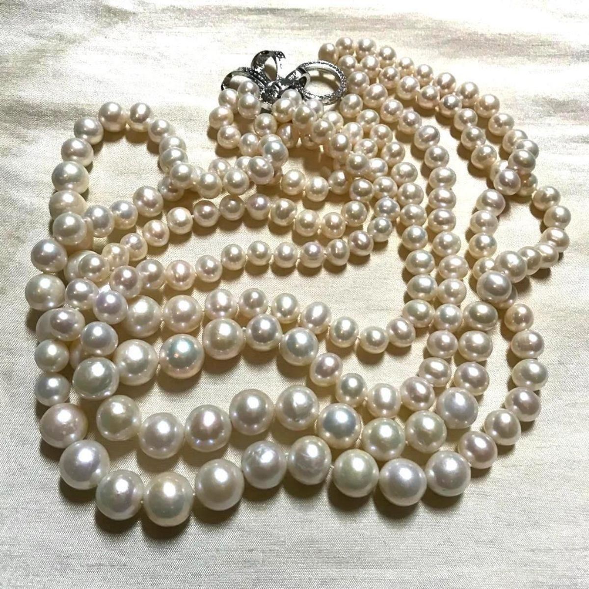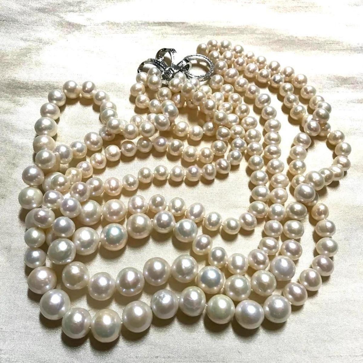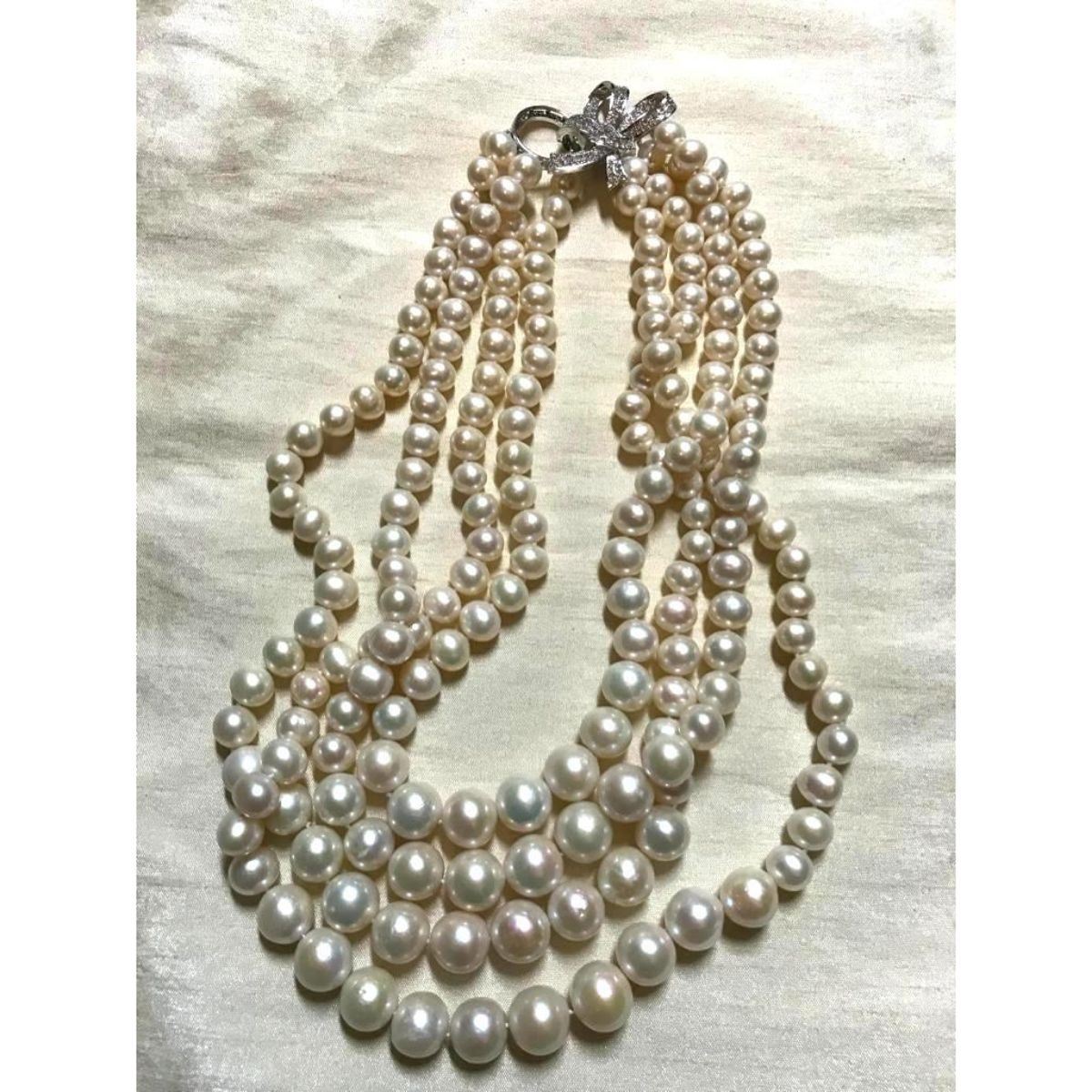 9-14mm shell pearls four strand necklace with stamped 925 sterling silver & crystal bow-shaped clasp. 16" - 22".