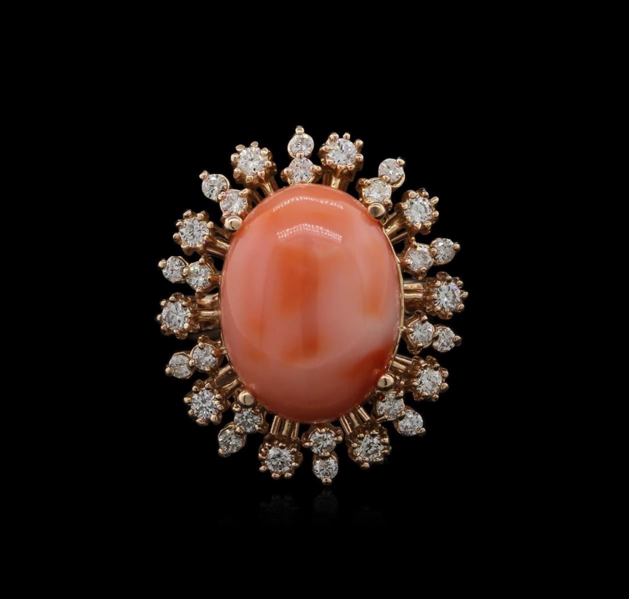 One ring featuring: 14KT rose gold weighing 6.48 grams containing one coral center stone with a total weight of 9.15ct and 30 diamonds with a total weight of 0.70ct.