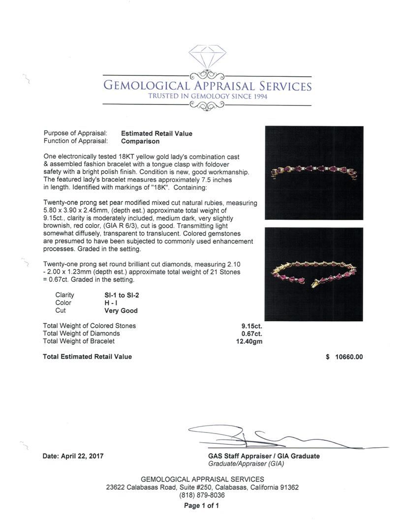 One electronically tested 18KT yellow gold lady's combination cast & assembled fashion bracelet with a tongue clasp with foldover safety with a bright polish finish. The featured lady's bracelet measures approximately 7.5 inches in length. Identified with markings of '18K'. Condition is new, good workmanship. Containing: Twenty-one prong set pear modified mixed cut natural rubies, measuring 5.80 x 3.90 x 2.45mm, (depth est.) approximate total weight of 9.15ct., clarity is moderately included, medium dark, very slightly brownish, red color, (GIA R 6/3), cut is good. Transmitting light somewhat diffusely, transparent to translucent. Colored gemstones are presumed to have been subjected to commonly used enhancement processes. Graded in the setting. Twenty-One prong set round brilliant cut diamonds, measuring 2.10 - 2.00 x 1.23mm (depth est.) approximate total weight of 21 Stones = 0.67ct. Graded in the setting. Color H - I Clarity SI-1 to SI-2 Cut Very Good. Total Weight of Colored Stones 9.15ct.. Total Weight of Diamonds 0.67ct.. Total Weight of Bracelet 12.40gm GAS Appraised at $10660.00. GAS Appraised at $10,660.00.