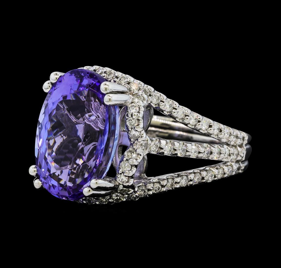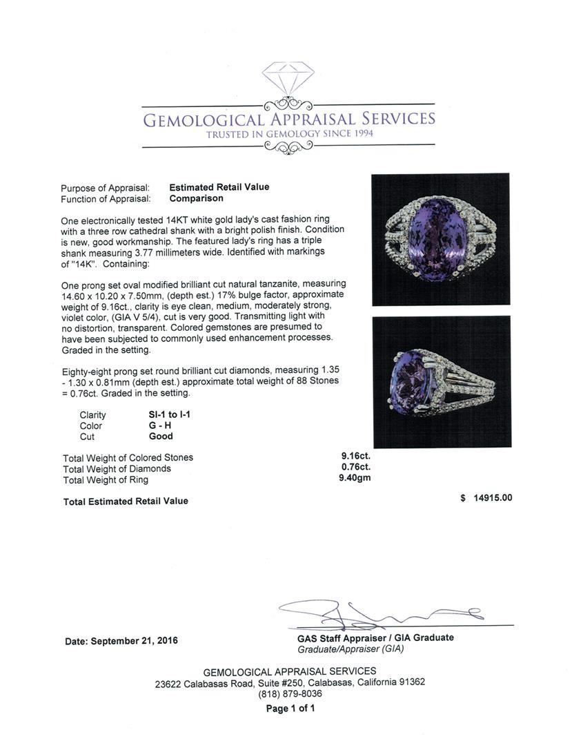 One electronically tested 14KT white gold lady's cast fashion ring with a three row cathedral shank with a bright polish finish. The featured lady's ring has a triple shank measuring 3.77 millimeters wide. Identified with markings of '14K'. Condition is new, good workmanship. Containing: One prong set oval modified brilliant cut natural tanzanite, measuring 14.60 x 10.20 x 7.50mm, (depth est.) 17%. bulge factor, approximate weight of 9.16ct., clarity is eye clean, medium, moderately strong, violet color, (GIA V 5/4), cut is very good. Transmitting light with no distortion, transparent. Colored gemstones are presumed to have been subjected to commonly used enhancement processes. Graded in the setting. Eighty-Eight prong set round brilliant cut diamonds, measuring 1.35 - 1.30 x 0.81mm (depth est.) approximate total weight of 88 Stones = 0.76ct. Graded in the setting. Clarity SI-1 to I-1. Color: G - H Cut Good. Total Weight of Colored Stones 9.16ct.. Total Weight of Diamonds 0.76ct.. Total Weight of Ring 9.40gm. GAS Appraised at $14,915.00.