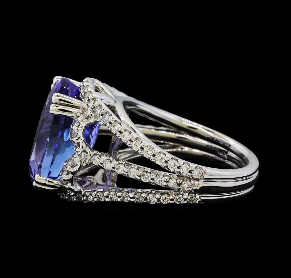 One electronically tested 14KT white gold lady's cast fashion ring with a three row cathedral shank with a bright polish finish. The featured lady's ring has a triple shank measuring 3.77 millimeters wide. Identified with markings of '14K'. Condition is new, good workmanship. Containing: One prong set oval modified brilliant cut natural tanzanite, measuring 14.60 x 10.20 x 7.50mm, (depth est.) 17%. bulge factor, approximate weight of 9.16ct., clarity is eye clean, medium, moderately strong, violet color, (GIA V 5/4), cut is very good. Transmitting light with no distortion, transparent. Colored gemstones are presumed to have been subjected to commonly used enhancement processes. Graded in the setting. Eighty-Eight prong set round brilliant cut diamonds, measuring 1.35 - 1.30 x 0.81mm (depth est.) approximate total weight of 88 Stones = 0.76ct. Graded in the setting. Clarity SI-1 to I-1. Color: G - H Cut Good. Total Weight of Colored Stones 9.16ct.. Total Weight of Diamonds 0.76ct.. Total Weight of Ring 9.40gm. GAS Appraised at $14,915.00.