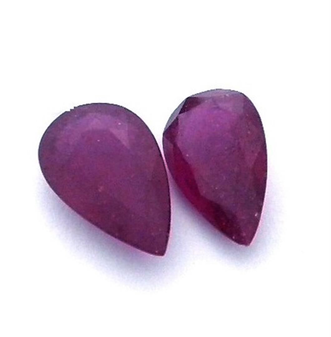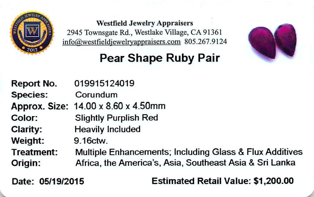 Two pear mixed cut natural rubies, measuring 14.00 x 8.60 x 4.50mm, exact total weight 9.16ct., clarity is heavily included, type II, dark, very slightly brownish, slightly purplish red color, (GIA slpR 7/3), cut is good. Measurements are an average for the pair. Transmitting light somewhat diffusely, transparent to translucent. Naturally occurring internal & external characteristics are present. Indications of laboratory high temperature heat treatment, with glass & flux additives. Westfield Appraised at $1,200.00.