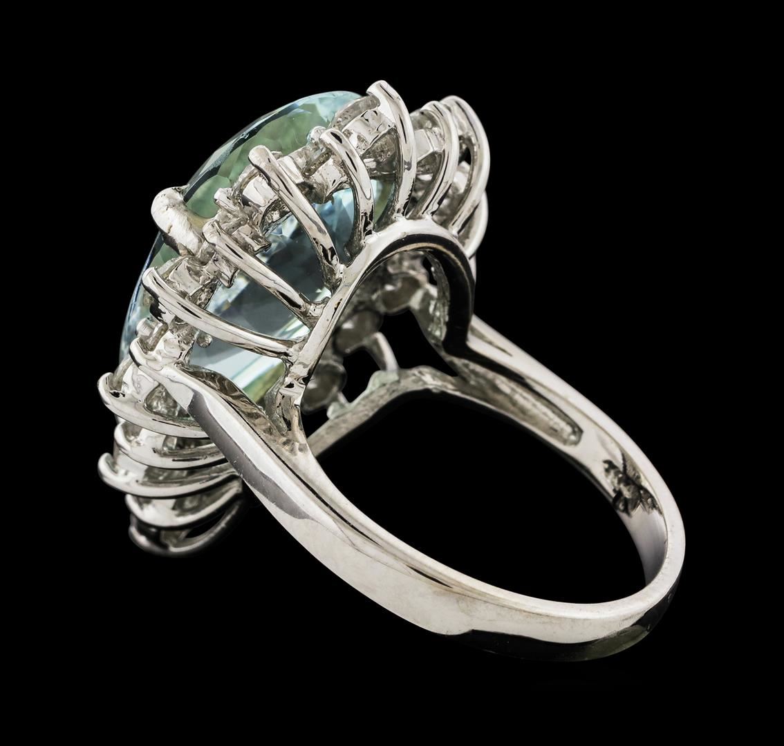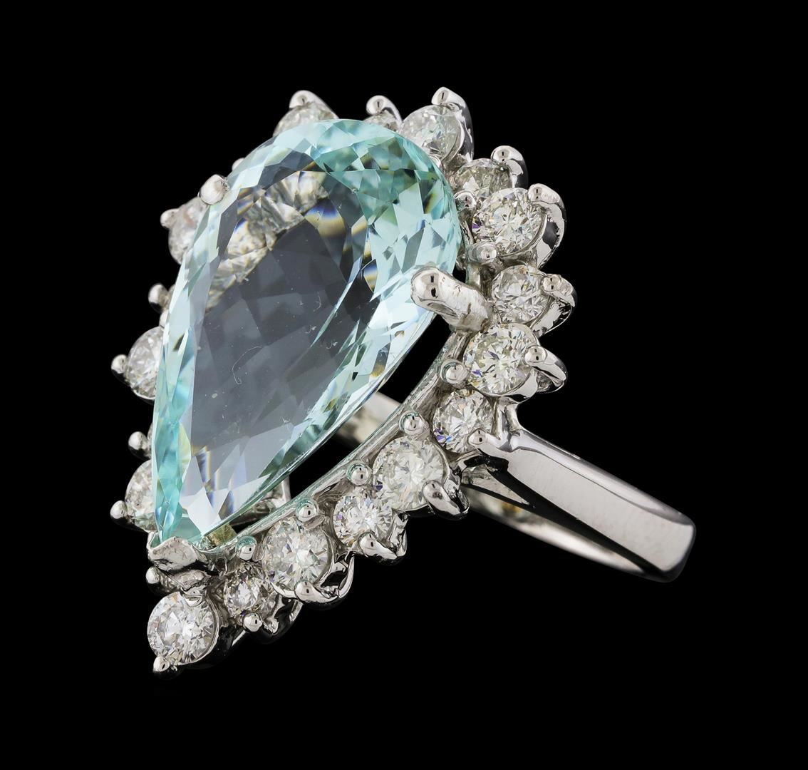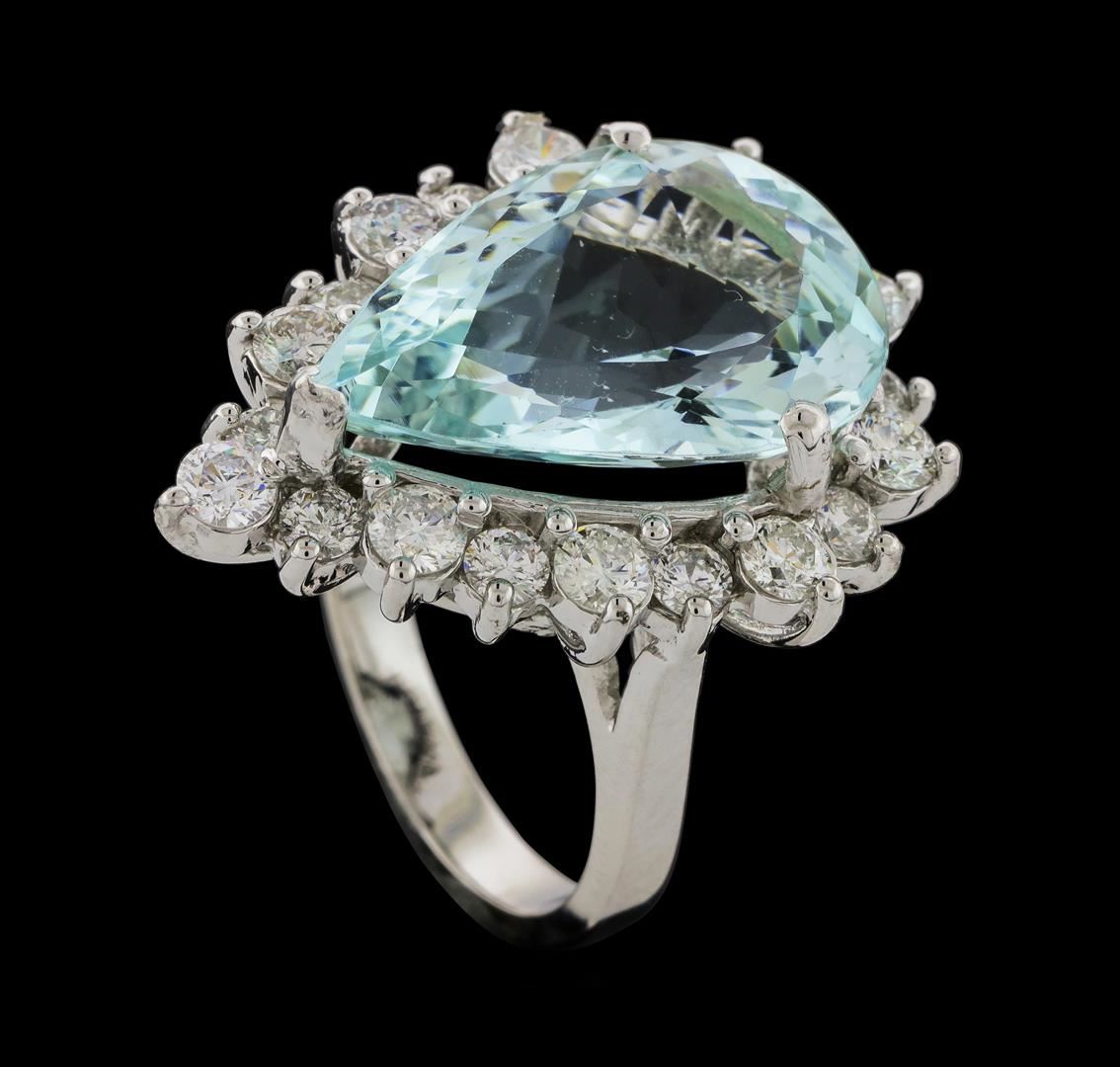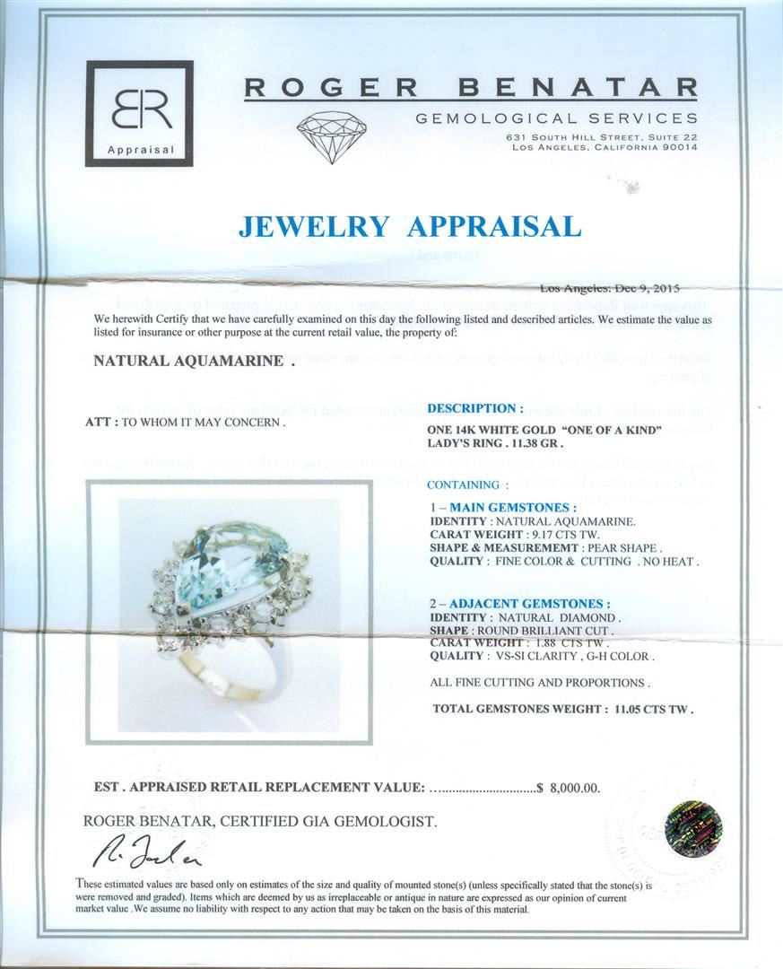 One 14KT White Gold "One of a Kind" Lady's Ring, 11.38 grams. Containing: Main Gemstones: Identity: Natural Aquamarine. Carat Weight: 9.17 cts tw. Shape & Measurement: Pear Shape. Quality: Fine color & cutting. No heat. Adjacent Gemstones: Identity: Natural Diamond. Shape: Round Brilliant Cut. Carat Weight: 1.88 cts tw. Quality: VS-SI Clarity, G-H Color. All fine cutting and proportions. Total Gemstones Weight: 11.05 cts tw. RBGS Appraised at $8,000.00.