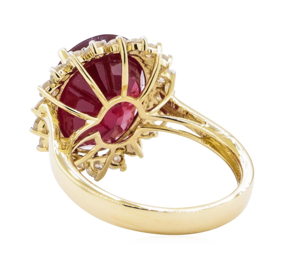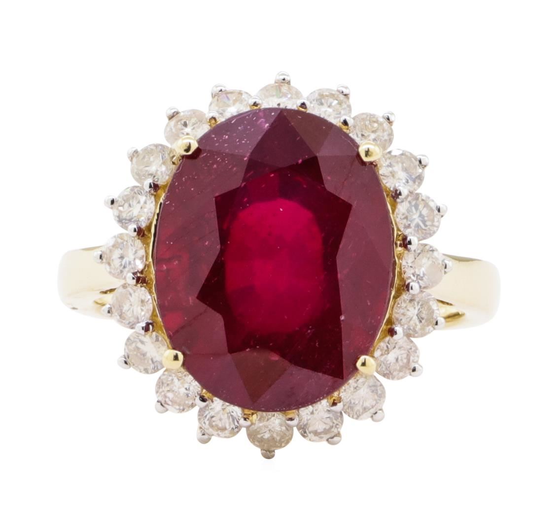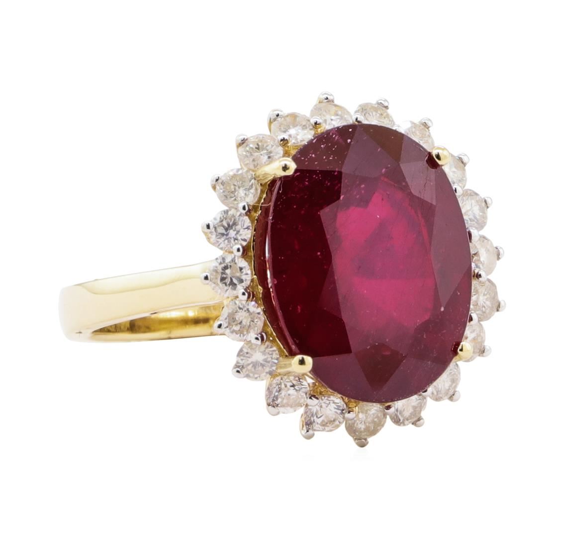 One electronically tested 14KT yellow gold ladies cast ruby & diamond ring. The featured ruby is set within a diamond bezel, completed by a three millimeter wide band. Bright polish finish with rhodium accents. Trademark is Orianne. Identified with markings of "14K". Condition is new, good workmanship. Containing: One prong set oval cut natural ruby, measuring 14.30 x 11.10 x 6.60mm, approximate weight of 9.18ct., clarity is heavily included, type II, medium dark, slightly brownish, slightly purplish red color, (GIA slpR 6/2), cut is good. Transmitting light with a minimum of distortion, transparent. Naturally occurring internal & external characteristics are present. Indications of laboratory high temperature heat treatment, with glass & flux additives. Graded in the setting. Ruby has a low tolerance to rhodium plating, repolishing the surface, & ultrasonic cleaning. Twenty prong set round brilliant cut diamonds, measuring 2.30 - 2.30 x 1.38mm (depth est.) approximate total weight of 20 Stones = 0.94ct. Graded in the setting. Clarity SI-1 to I-1 Color F - H Total Weight of Colored Stones 9.18 ct. Total Weight of Diamonds 0.94 ct. Total Weight of Ring 5.40 gm Estimated Retail Value $ 4,890.00 US AIG Appraised.