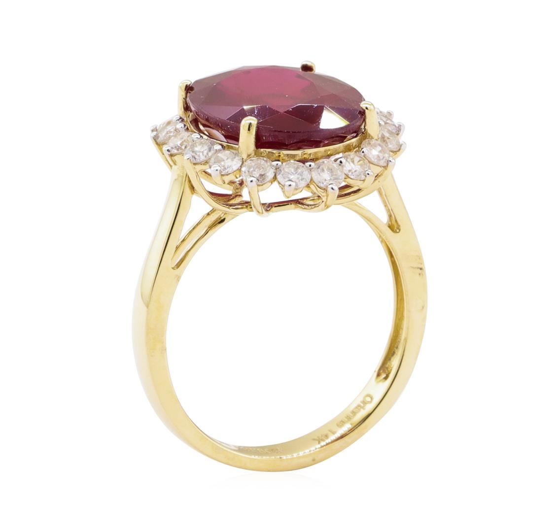 One electronically tested 14KT yellow gold ladies cast ruby & diamond ring. The featured ruby is set within a diamond bezel, completed by a three millimeter wide band. Bright polish finish with rhodium accents. Trademark is Orianne. Identified with markings of "14K". Condition is new, good workmanship. Containing: One prong set oval cut natural ruby, measuring 14.30 x 11.10 x 6.60mm, approximate weight of 9.18ct., clarity is heavily included, type II, medium dark, slightly brownish, slightly purplish red color, (GIA slpR 6/2), cut is good. Transmitting light with a minimum of distortion, transparent. Naturally occurring internal & external characteristics are present. Indications of laboratory high temperature heat treatment, with glass & flux additives. Graded in the setting. Ruby has a low tolerance to rhodium plating, repolishing the surface, & ultrasonic cleaning. Twenty prong set round brilliant cut diamonds, measuring 2.30 - 2.30 x 1.38mm (depth est.) approximate total weight of 20 Stones = 0.94ct. Graded in the setting. Clarity SI-1 to I-1 Color F - H Total Weight of Colored Stones 9.18 ct. Total Weight of Diamonds 0.94 ct. Total Weight of Ring 5.40 gm Estimated Retail Value $ 4,890.00 US