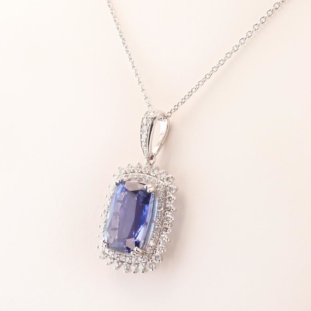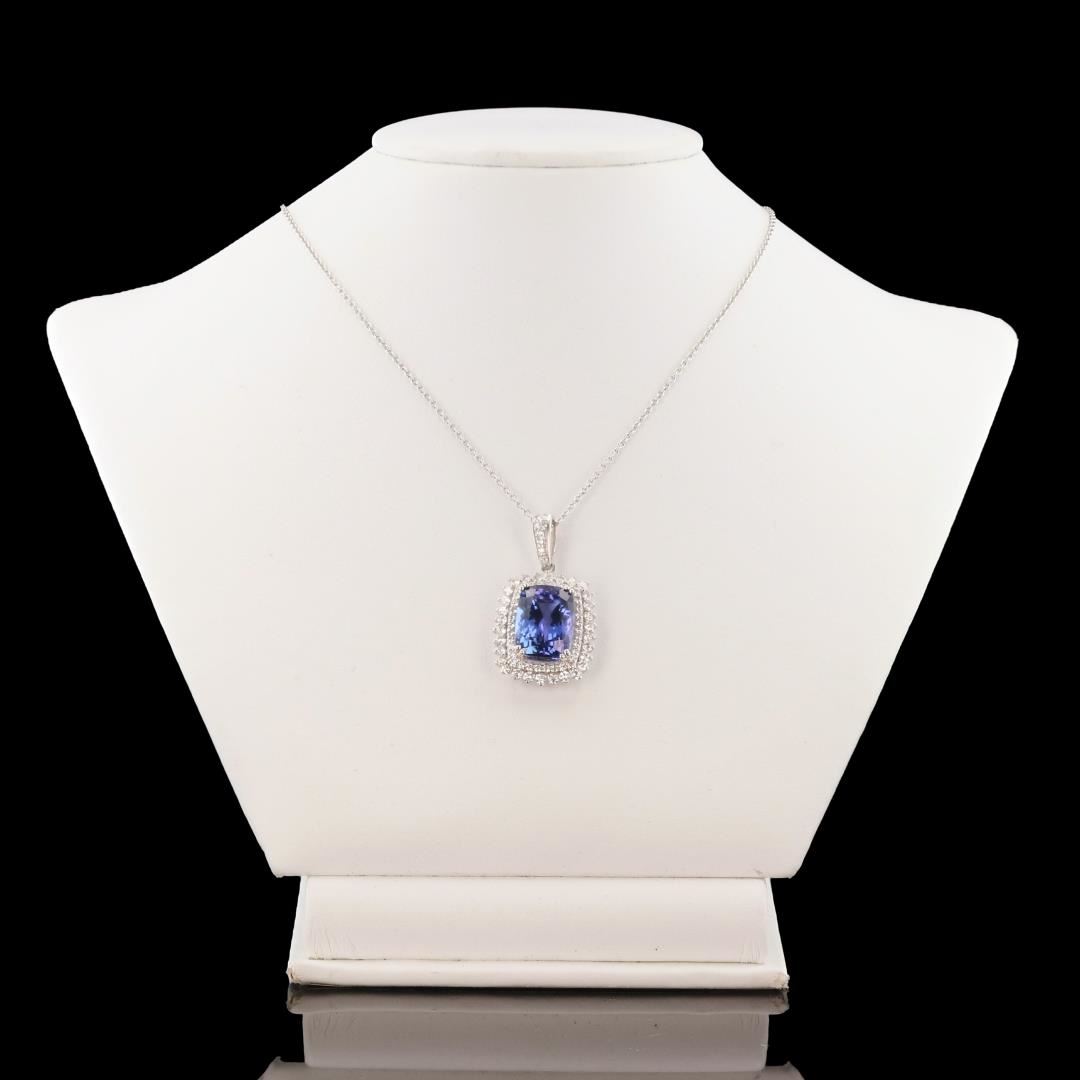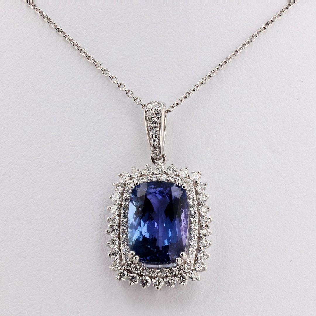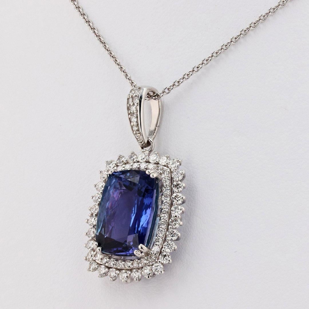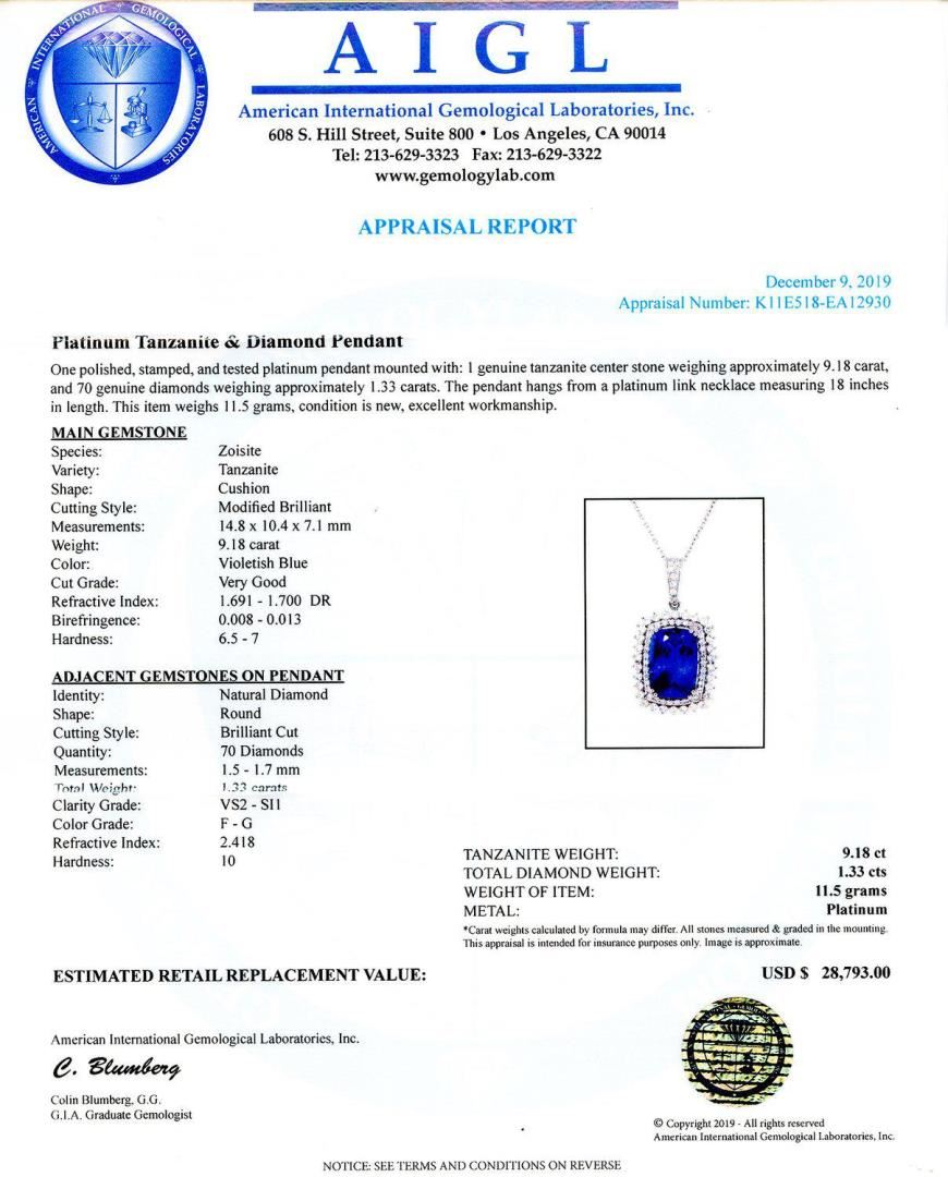 One polished, stamped, and tested platinum pendant mounted with: 1 genuine tanzanite center stone weighing approximately 9.18 carat, and 70 genuine diamonds weighing approximately 1.33 carats. The pendant hangs from a platinum link necklace measuring 18 inches in length. This item weighs 11.5 grams, condition is new, excellent workmanship. MAIN GEMSTONE Species: Zoisite Variety: Tanzanite Shape: Cushion Cutting Style: Modified Brilliant Measurements: 14.8mm x 10.4mm x 7.1mm Weight: 9.18 carat Color: Violetish Blue Cut Grade: Very Good Refractive Index: 1.691 - 1.700 DR Birefringence: 0.008 - 0.013 Hardness: 6.5 - 7 ADJACENT GEMSTONES ON PENDANT Identity: Natural Diamond Shape: Round Cutting Style: Brilliant Cut Quantity: 70 Diamonds Measurements: 1.5mm to 1.7mm Total Weight- 1.33 carats Clarity Grade: VS2 to SI1 Color Grade: F - G Refractive Index: 2.418 Hardness: 10 TANZANITE WEIGHT: 9.18 ct TOTAL DIAMOND WEIGHT: 1.33 cts WEIGHT OF ITEM: 11.5 grams METAL: Platinum #Size: 18