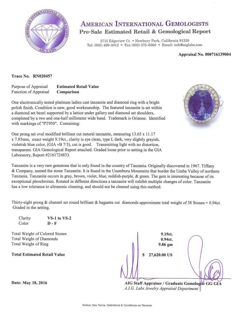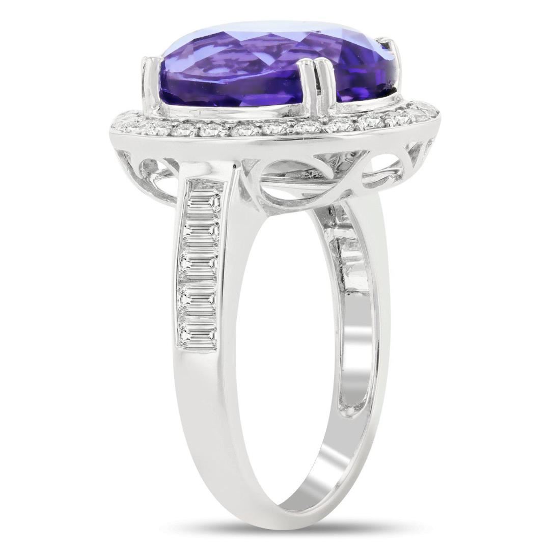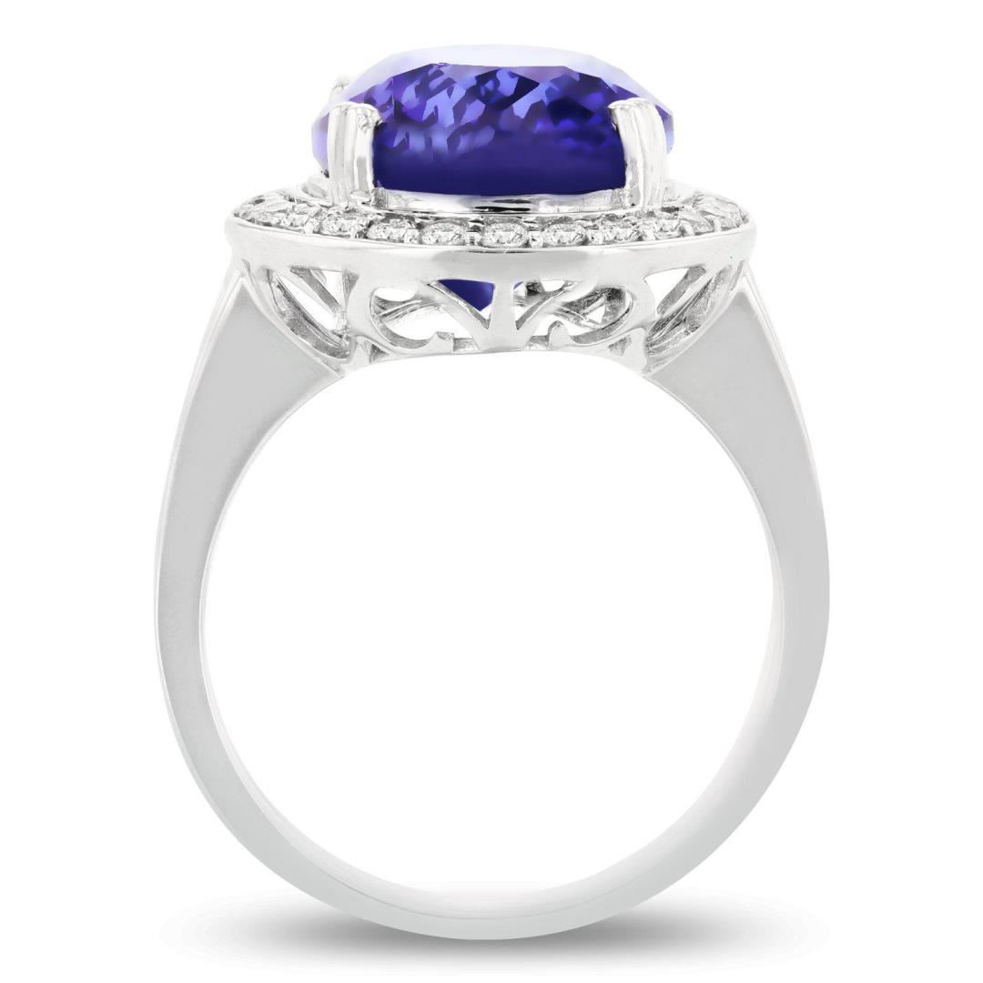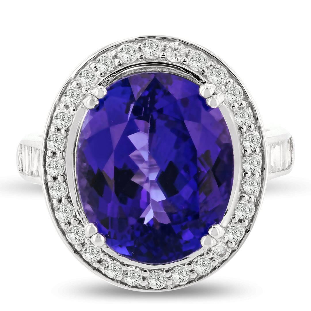 One electronically tested platinum ladies cast tanzanite and diamond ring with a bright polish finish. The featured tanzanite is set within a diamond set bezel supported by a lattice under gallery and diamond set shoulders, completed by a two and one-half