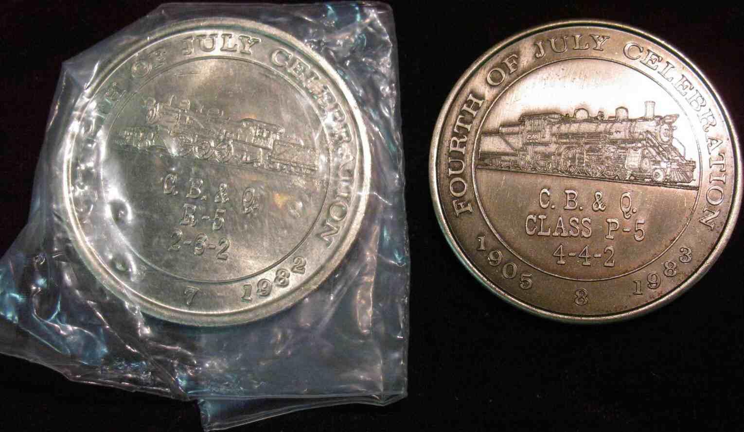 9. 1982 & 83 C.B. & Q. Railroad Medals, Creston, Ia. BU