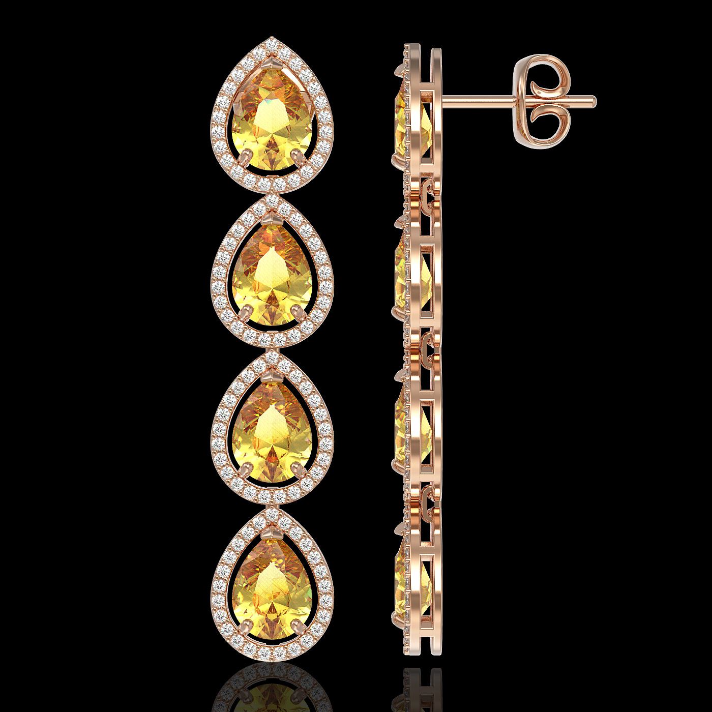 REF-154W2F -41325 ---- 9.2 CTW Fancy Citrine & Diamond Halo Earrings 10K Rose Gold ---- Luxury Designer Brand Earring Appraised at $8,500 Certificate Number US41325  10k Rose gold,  Earring Size is 2 Inches Long, Earring measuring approx. 10 mm x 2 Inches, weighing in total approx. 8 grams. Made in the USA and is stamped 10k, Main stone 7.6 carat total weight containing 8 pieces of Intense Translucent Yellow color with AAA quality Pear shape cut Citrine , Stone #2 1.6 carat total weight containing 200 pieces of G-H color with  VS/SI quality Round shape cut Diamond