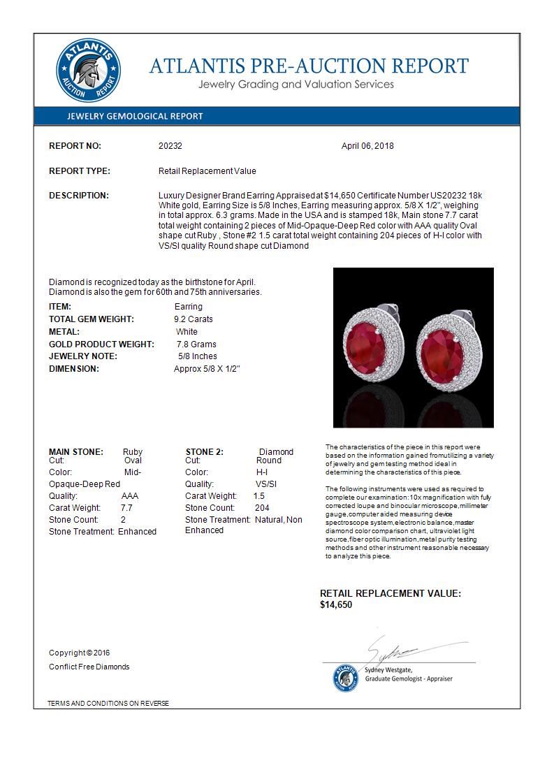 REF-190W2F -20232 ---- 9.20 CTW Ruby & Micro Pave VS/SI Diamond Earrings 18K White Gold ---- Luxury Designer Brand Earring Appraised at $14,650 Certificate Number US20232 18k White gold, Earring Size is 5/8 Inches, Earring measuring approx. 5/8 X 1/2", weighing in total approx. 6.3 grams. Made in the USA and is stamped 18k, Main stone 7.7 carat total weight containing 2 pieces of Mid-Opaque-Deep Red color with AAA quality Oval shape cut Ruby , Stone #2 1.5 carat total weight containing 204 pieces of H-I color with VS/SI quality Round shape cut Diamond