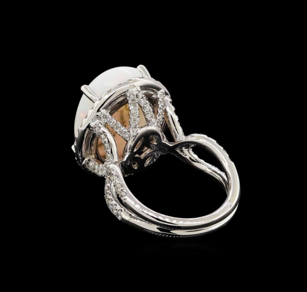 One electronically tested 14KT white gold lady's cast fashion ring with a split crossover shank with halo with a bright polish finish. The featured lady's ring has a double shank measuring 3.40 millimeters wide. Identified with markings of '14K'. Condition is new, good workmanship. Containing: One crystal opal that is cut in a oval shaped cabochon and is prong set, measuring 17.52 mm long x 13.20 mm wide, and 8.28 mm thick and the approximate weight is 9.20 carats. The opal has a somewhat bright, multicolor play of color (fire) in a rolling flashfire pattern; a medium dome; a good cut; no inclusions; minor dull spot in its brightness and pattern; and is not directional. Graded in the setting. Seventy-Four prong set round brilliant cut diamonds, measuring 1.60 - 1.50 x 0.96mm (depth est.) approximate total weight of 74 Stones = 1.05ct. Graded in the setting. Clarity SI-1 to I-1. Color: G - I Cut Good Forty prong set round brilliant cut diamonds, measuring 1.20 - 1.15 x 0.73mm (depth est.) approximate total weight of 40 Stones = 0.25ct. Graded in the setting. Clarity SI-1 to I-1. Color: G - I Cut Good. Total Weight of Diamonds 1.30ct.. Total Weight of Opals 9.20ct.. Total Weight of Ring 10.20gm. GAS Appraised.