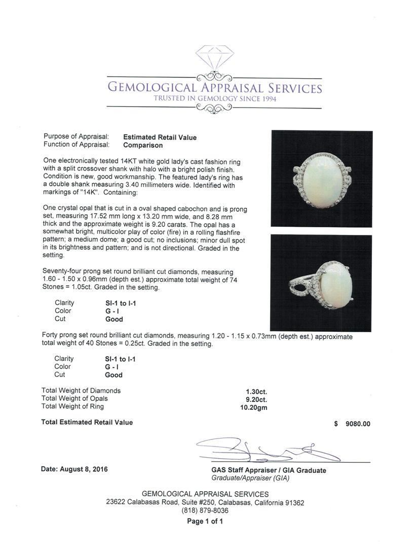 One electronically tested 14KT white gold lady's cast fashion ring with a split crossover shank with halo with a bright polish finish. The featured lady's ring has a double shank measuring 3.40 millimeters wide. Identified with markings of '14K'. Condition is new, good workmanship. Containing: One crystal opal that is cut in a oval shaped cabochon and is prong set, measuring 17.52 mm long x 13.20 mm wide, and 8.28 mm thick and the approximate weight is 9.20 carats. The opal has a somewhat bright, multicolor play of color (fire) in a rolling flashfire pattern; a medium dome; a good cut; no inclusions; minor dull spot in its brightness and pattern; and is not directional. Graded in the setting. Seventy-Four prong set round brilliant cut diamonds, measuring 1.60 - 1.50 x 0.96mm (depth est.) approximate total weight of 74 Stones = 1.05ct. Graded in the setting. Clarity SI-1 to I-1. Color: G - I Cut Good Forty prong set round brilliant cut diamonds, measuring 1.20 - 1.15 x 0.73mm (depth est.) approximate total weight of 40 Stones = 0.25ct. Graded in the setting. Clarity SI-1 to I-1. Color: G - I Cut Good. Total Weight of Diamonds 1.30 ct.. Total Weight of Opals 9.20 ct.. Total Weight of Ring 10.20gm. GAS Appraised.