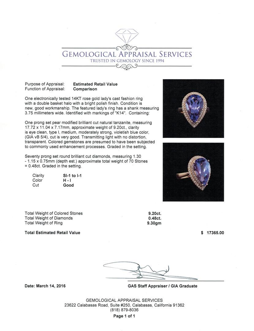 One electronically tested 14KT rose gold lady's cast fashion ring with a double basket halo with a bright polish finish. The featured lady's ring has a shank measuring 3.75 millimeters wide. Identified with markings of "K14". Condition is new, good workmanship. Containing: One prong set pear modified brilliant cut natural tanzanite, measuring 17.72 x 11.04 x 7.17mm, approximate weight of 9.20ct., clarity is eye clean, type I, medium, moderately strong, violetish blue color, (GIA vB 5/4), cut is very good. Transmitting light with no distortion, transparent. Colored gemstones are presumed to have been subjected to commonly used enhancement processes. Graded in the setting. Seventy prong set round brilliant cut diamonds, measuring 1.30 - 1.15 x 0.75mm (depth est.) approximate total weight of 70 Stones = 0.48ct. Graded in the setting. Clarity: SI-1 to I-1. Color: H - I. Cut Good. Total Weight of Colored Stones 9.20ct. Total Weight of Diamonds 0.48ct. Total Weight of Ring 9.30gm. GAS Appraised at $17,365.00.