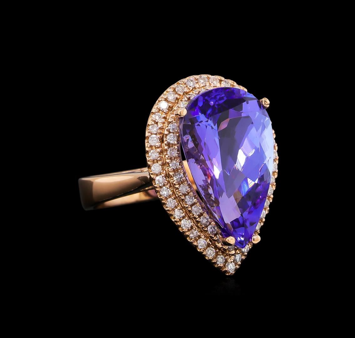One electronically tested 14KT rose gold lady's cast fashion ring with a double basket halo with a bright polish finish. The featured lady's ring has a shank measuring 3.75 millimeters wide. Identified with markings of "K14". Condition is new, good workmanship. Containing: One prong set pear modified brilliant cut natural tanzanite, measuring 17.72 x 11.04 x 7.17mm, approximate weight of 9.20ct., clarity is eye clean, type I, medium, moderately strong, violetish blue color, (GIA vB 5/4), cut is very good. Transmitting light with no distortion, transparent. Colored gemstones are presumed to have been subjected to commonly used enhancement processes. Graded in the setting. Seventy prong set round brilliant cut diamonds, measuring 1.30 - 1.15 x 0.75mm (depth est.) approximate total weight of 70 Stones = 0.48ct. Graded in the setting. Clarity: SI-1 to I-1. Color: H - I. Cut Good. Total Weight of Colored Stones 9.20ct. Total Weight of Diamonds 0.48ct. Total Weight of Ring 9.30gm. GAS Appraised at $17,365.00.