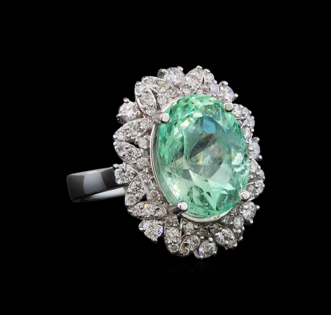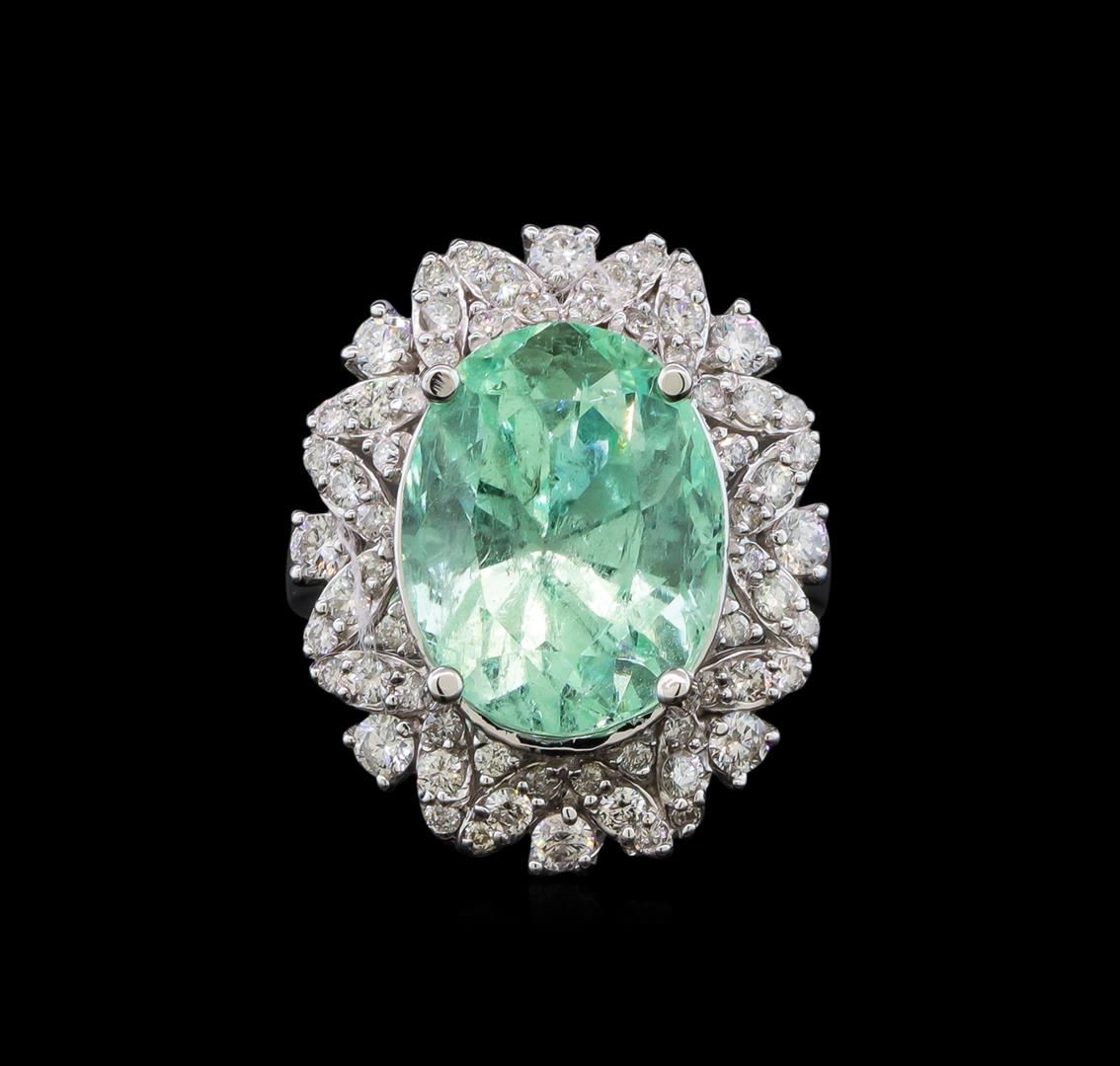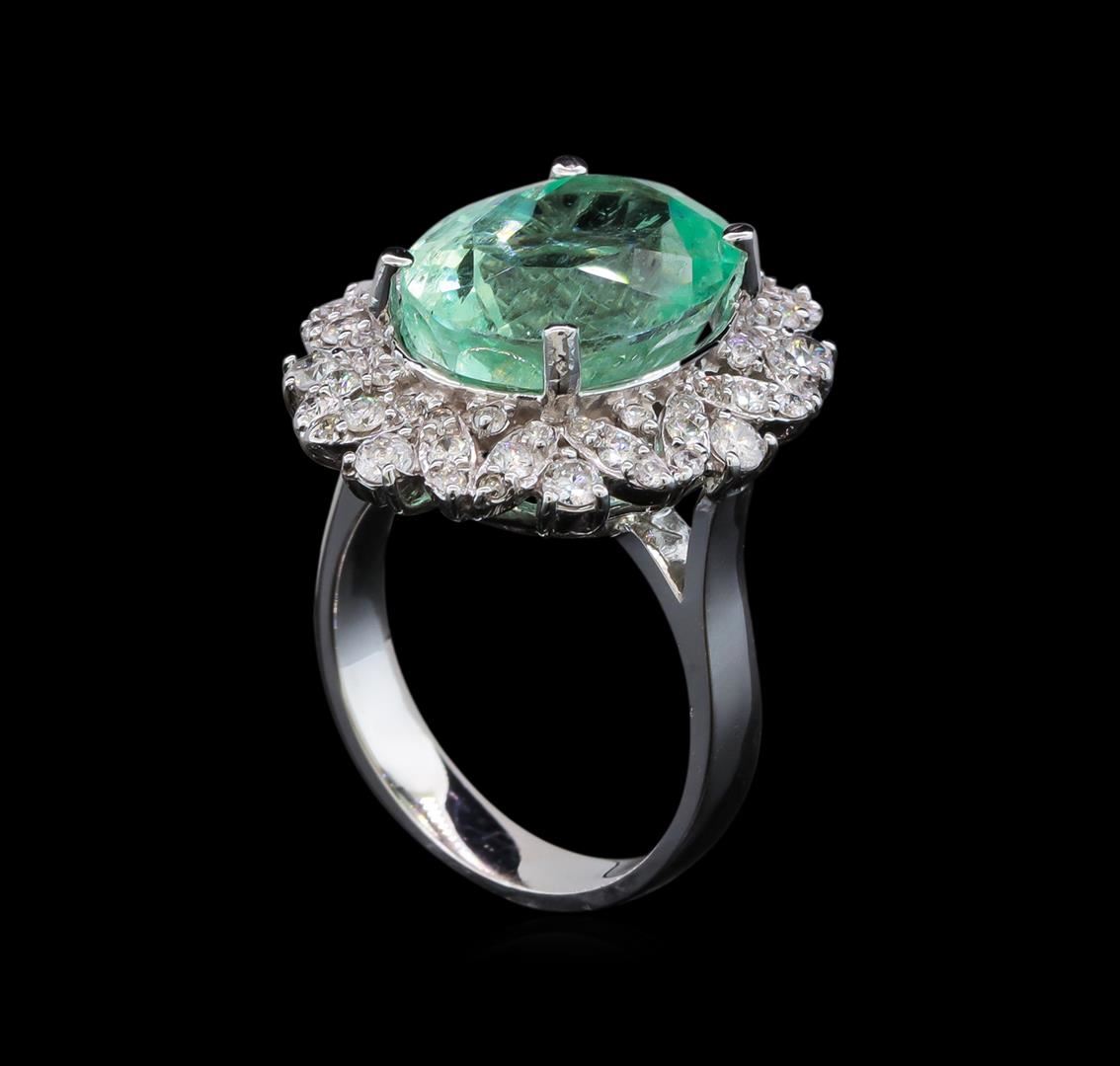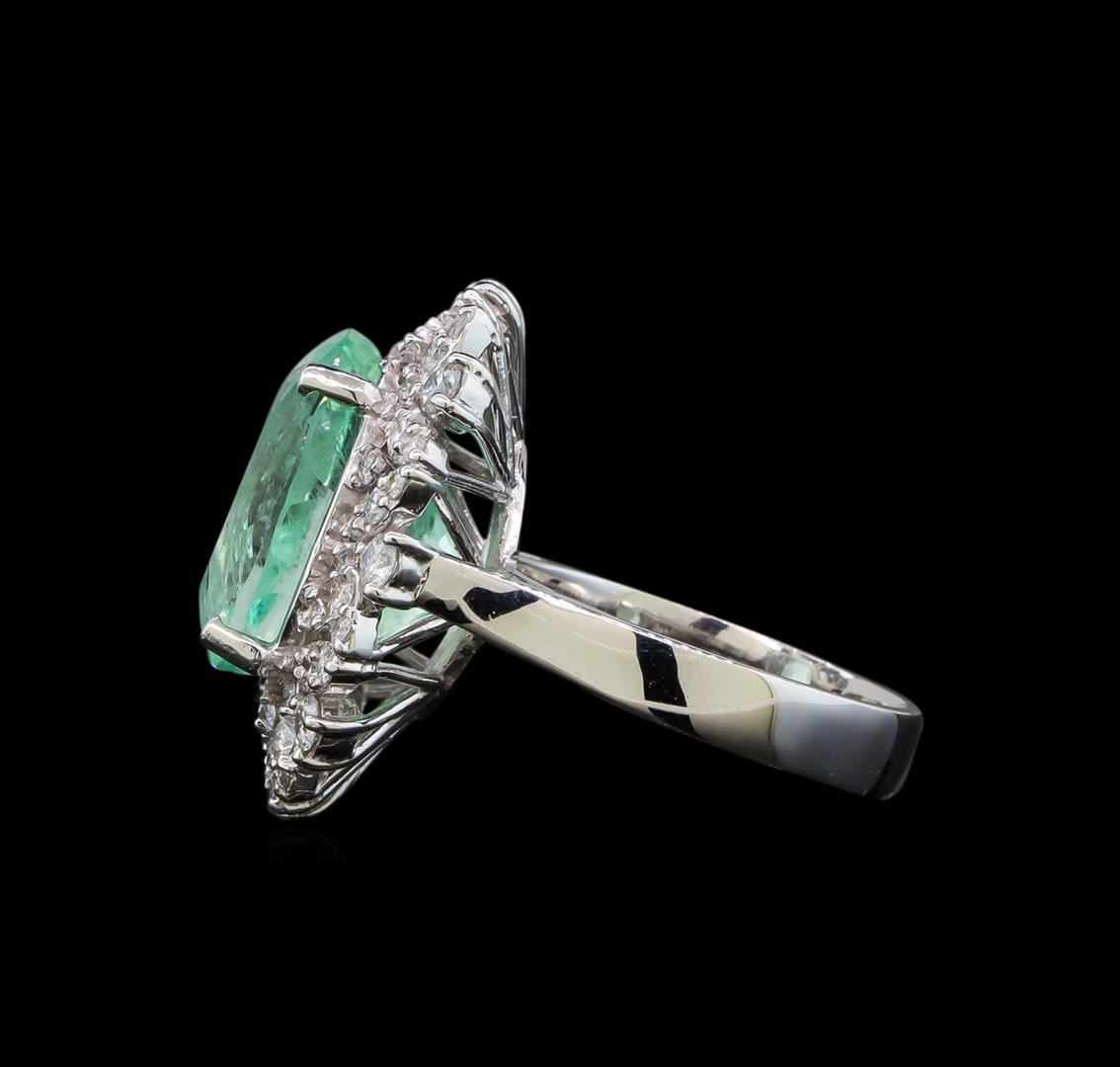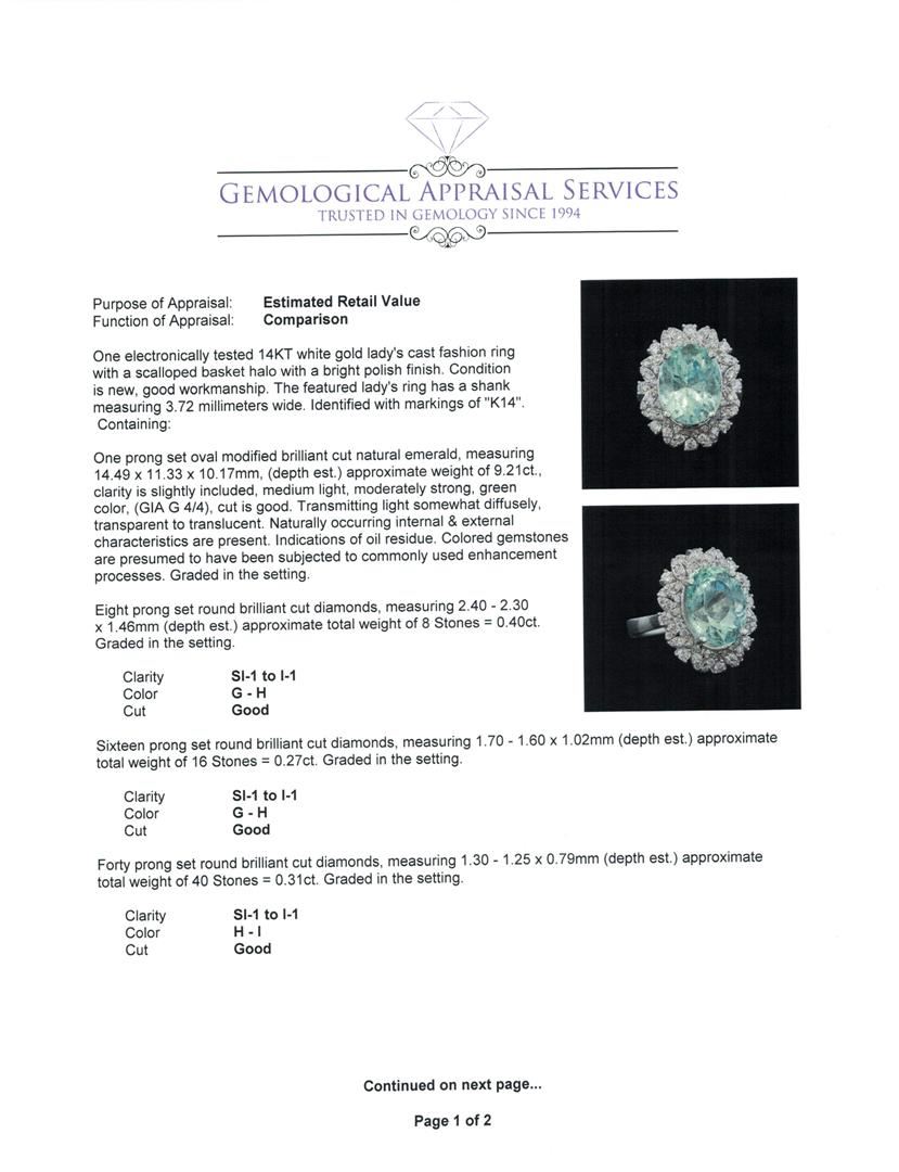 One electronically tested 14KT white gold lady's cast fashion ring with a scalloped basket halo with a bright polish finish. The featured lady's ring has a shank measuring 3.72 millimeters wide. Identified with markings of 'K14'. Condition is new, good workmanship. Containing: One prong set oval modified brilliant cut natural emerald, measuring 14.49 x 11.33 x 10.17mm, (depth est.) approximate weight of 9.21ct., clarity is slightly included, medium light, moderately strong, green color, (GIA G 4/4), cut is good. Transmitting light somewhat diffusely, transparent to translucent. Naturally occurring internal & external characteristics are present. Indications of oil residue. Colored gemstones are presumed to have been subjected to commonly used enhancement processes. Graded in the setting. Eight prong set round brilliant cut diamonds, measuring 2.40 - 2.30 x 1.46mm (depth est.) approximate total weight of 8 Stones = 0.40ct. Graded in the setting. Clarity SI-1 to I-1. Color: G - H Cut Good Sixteen prong set round brilliant cut diamonds, measuring 1.70 - 1.60 x 1.02mm (depth est.) approximate total weight of 16 Stones = 0.27ct. Graded in the setting. Clarity SI-1 to I-1. Color: G - H Cut Good Forty prong set round brilliant cut diamonds, measuring 1.30 - 1.25 x 0.79mm (depth est.) approximate total weight of 40 Stones = 0.31ct. Graded in the setting. Clarity SI-1 to I-1. Color: H - I Cut Good. Total Weight of Colored Stones 9.21ct.. Total Weight of Diamonds 0.98ct.. Total Weight of Ring 9.30gm. GAS Appraised at $15,870.00.