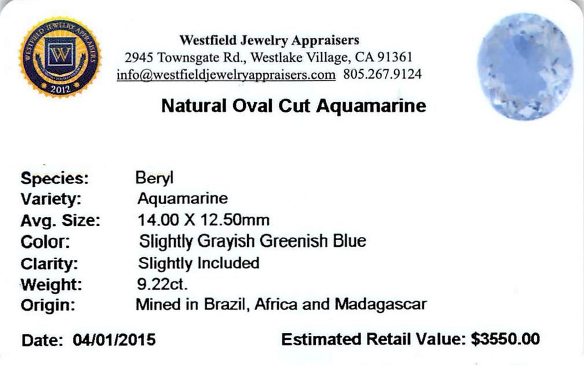 One oval cut natural aquamarine exact weight 9.22ct., clarity is slightly included, type I, medium, very slightly grayish, very slightly greenish blue color, (GIA vslgB 5/3), cut is good. Westfield Appraised at $3,550.00.