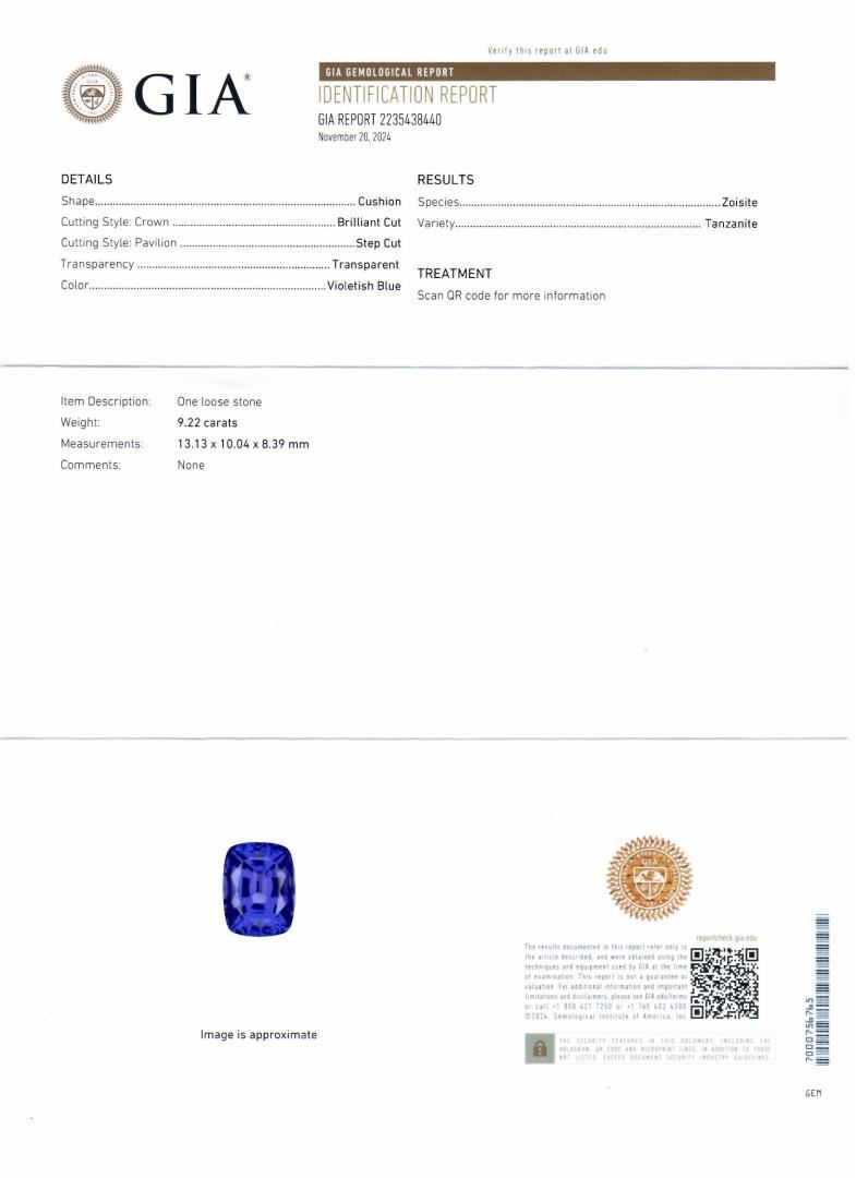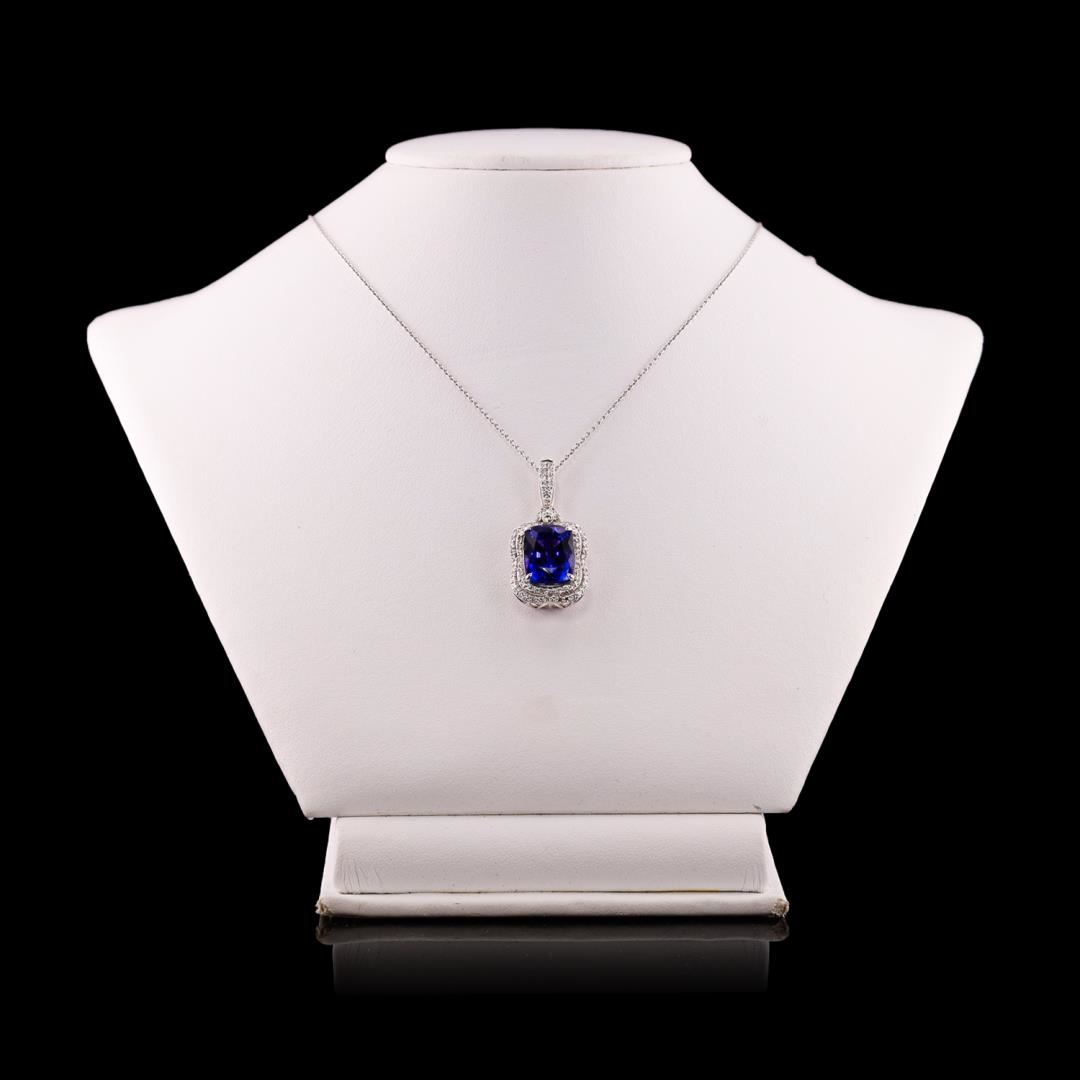 Platinum (PLAT) natural tanzanite zoisite and diamond pendant with chain. A cushion brilliant cut natural tanzanite zoisite gemstone is mounted in the center of the pendant. Round brilliant cut diamonds accent the pendant around and on top of the center gemstone. The pendant and chain have a gross weight of 11.4 Grams. Reference: GIA Tanzanite Report 2235438440 #NATURAL GEMSTONE# GEMSTONE: Ianzanite Zoisite; NATURE: Natural; SHAPE: Cushion Brilliant, Faceted Cut; WEIGHT: 9.22 carat total; DIMENSIONS: 13.13 x 10.04 x 8.39mm; CLARITY: Type 1; COLOR: Violetish Blue (5/5); SYMMETRY: Excellent; COLOR INTENSITY: Intense; TRANSPARENCY: Transparent; TONE: Dark #NATURAL DIAMOND# SHAPE: Round Brilliant Cut; WEIGHT: 0.85 carat total (94pcs.); DIMENSIONS: 1.7 x 1.0mm; AVERAGE CLARITY: VS1-VS2; AVERAGE COLOR: F-G; SYMMETRY: Excellent; POLISH: Excellent #METAL# METAL: Platinum; PURITY: 950; COLOR: White; CONDITION: Excellent; FINISH: High Polish #Size: 17