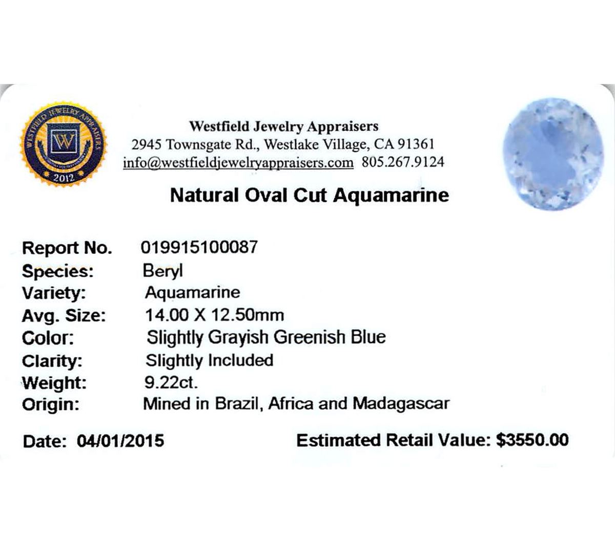 One oval cut natural aquamarine exact weight 9.22ct., clarity is slightly included, type I, medium, very slightly grayish, very slightly greenish blue color, (GIA vslgB 5/3), cut is good. Westfield Appraised at $3,550.00.